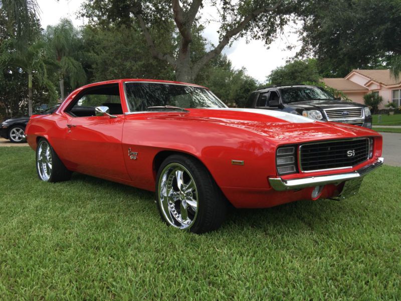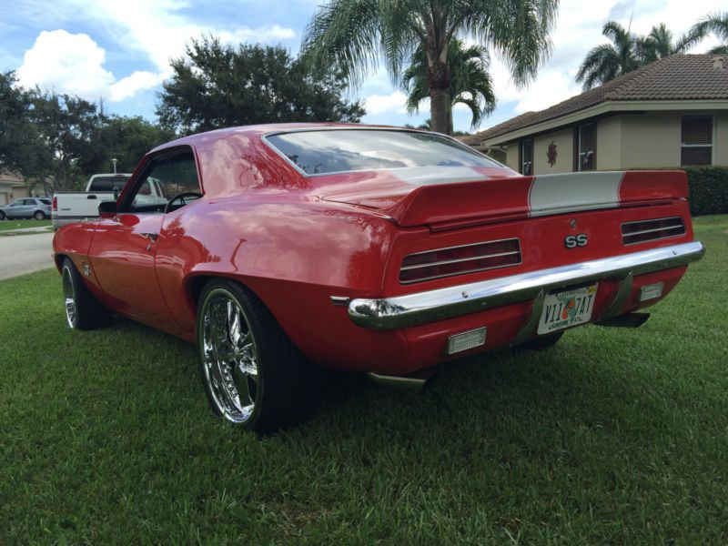 Beautiful 1969 Chevy Camaro SS/RS. This was the last of the 1st Generation Camaros. Its one of the most iconic cars ever built. The body is rock solid and Laser straight with good lines and fit of the panels. It has the Steel 2 Cowl hood with front and rear spoilers along with the RS Package. Everything is covered in the viper red, which is accented by the single white Stripe that is under the clear. The paint on this car is absolutely stunning with a deep rich shine. Both quarter panels, rocker panels and rear tail panel were replaced. All the glass looks good along with new stainless steel moldings . Also all the weather stripping are all brand new. New GM grille with electric hideaway lights. This Camaro has brand new outside dual Mirrors, door handles and has the SS emblems. All the chrome is new. The final touch is the New set of 18 and 20 Foose Wheels and new tires.