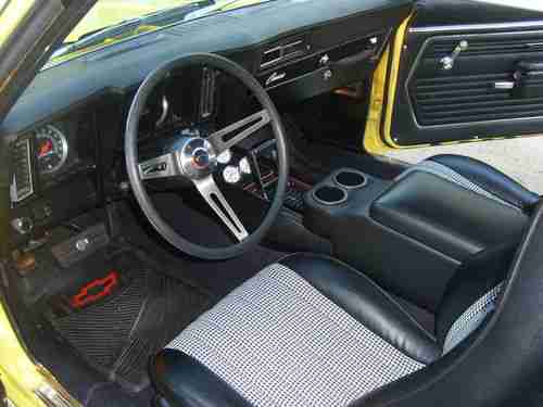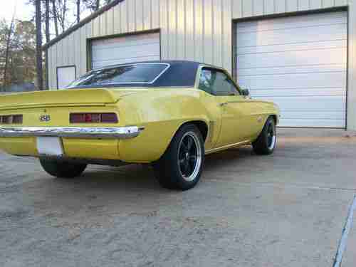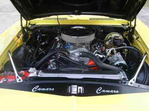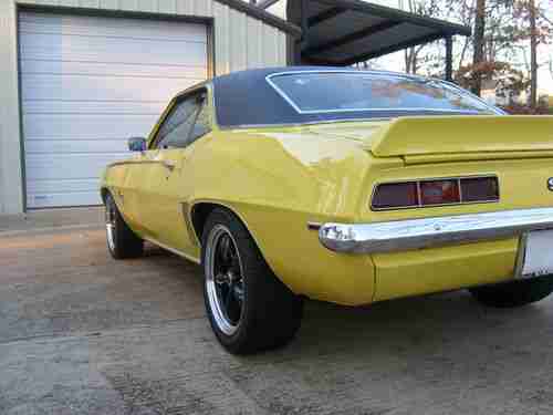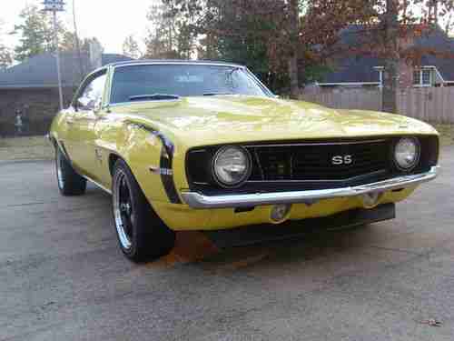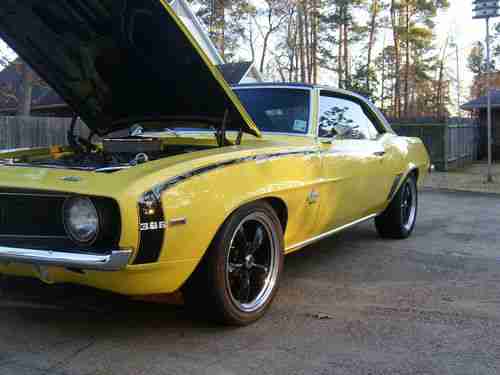 1969 Chevrolet Camaro. Excellent condition, built in Norwood, Ohio and restored in 2010. Only 3,600 miles since restoration. Original 76-B color code, Daytona Yellow, black vinyl top, black/white hounds-tooth interior with custom Camaro monogram on front bucket seats. Center console with gauges, 468 cubic inch Big Block, Holly Avenger 770 carb. coated intake, Thumper series roller, SRP Pistons, Eagle Rods, steel crank, coated headers, 4 core aluminum radiator, power steering, 4 wheel disc brakes, TCI transmission, 700R4 with 2800 stall converter, 12 posi trac, 355 gears, 17 " American Racing Wheels with 225-45ZR17 in front and 245-45ZR17 in rear. For more information contact Jimmy at (318) 422-3229 or email him at Jimmysglass@aol.com
