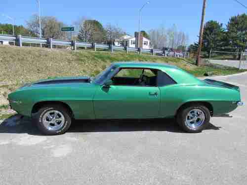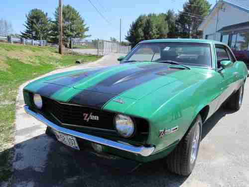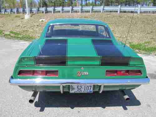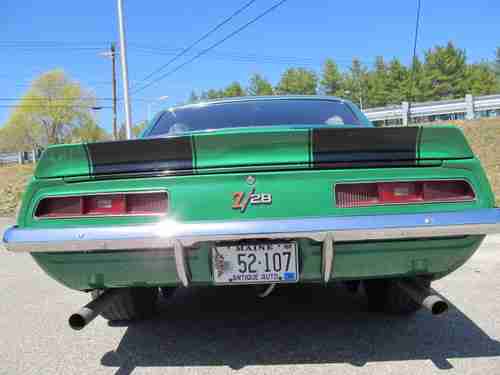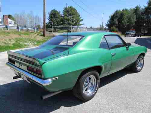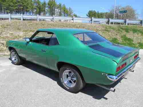 This auction is for a 1969 Chevrolet Camaro Coupe (not a true Z/28, just emblems). Prior owner had the car for the past 10 years. In that time frame this is some of the work that has been done to it. Has a 350 V-8 that has been completely rebuilt (11,000 miles since rebuild). Bored .40 over, roller rockers, close to $3,000 spent on motor alone. MSD ignition. M21 Muncie 4 Speed Transmission. 12 bolt posi traction 3:55 gear ratio. Custom Flow Master exhaust with Head Man headers. Power front disc brakes. Manual steering. Runs and drives great. Body in very decent shape. Has had 2 full rear quarters and according to prior owner the rest of the sheet metal is original to the car. Good solid floors, frame and under body. I did notice a couple of bubbles on the passenger door and 1 on the drivers side roof panel by the drip rail and 1 on the lower passenger fender. Bright emerald green paint. Driver quality condition. Nice set of wheels and tires. Interior is in decent shape. A console was added but guages are not hooked up at the moment. Has a fairly expensive Sony CD player with remote control, Ipod etc. Electric fuel pump and filter system is installed in the trunk. Everything on the car works except the guages. We have a folder full of reciepts for work done and a CD disk to document the restoration of the car. This is not a show car just a good driver quality car. This is a turn key drive it home Camaro. We have a current Maine registration and proper transfer forms should you need a title in your state.If you need more pics or info feel free to call or email us at 207-324-5568 days or 207-432-2862 eves and sundays