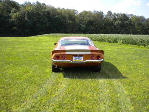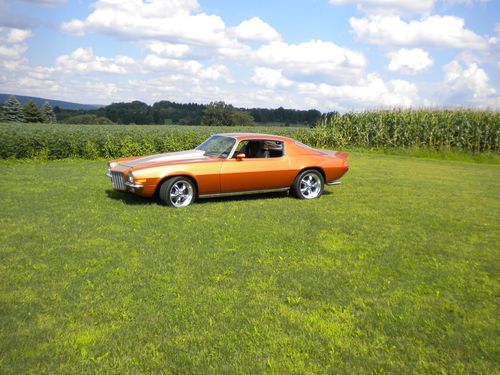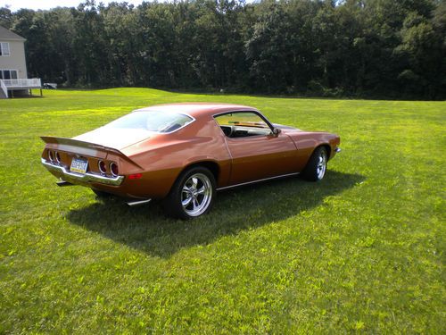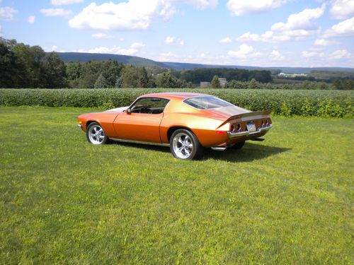 im selling my 1970 camaro that was an original standard camaro that i customized in 2006. this car was transformed into the car it is today. ill try and list all the goodies i have in it and also what needs to be done to complete the project. the floor was replaced from firewall to taipan. all the body mounts were replaced with polyurethane bushings. it has a rebuilt 327 v8 that was reworked and has just over 4000 miles on it since i redid the car. i put in it a be cool aluminum radiator with electric fan. it has a zaganaw 4 speed manual transmission and 411 gears in the rear. i replaced all the brakes with wilwoods disc brake conversion kit. it has a flowmaster american thunder exhaust system with ceramic coated headers. it has american racing polished wheels and cooper zeon tires. 17's up front and 18's in the back. all chrome was replaced or rechromed. it has all new power brake booster and master cylinder with all new stainless steel brake lines front to back. the paint is a nissan copper with a custom stripe that was hand painted on. door handles are shaved and has poppers on the door. front windshield was replaced. at this point of the restoration i got tired and wanted to drive it so i never finished the interior(see pics) i have a new headliner, front door panels, dash pad, rear side panels that go with the car. i have easyily invested over 35 k in this car but understand it will take a little money to finish it. if i cant get what i think is fair i will keep it cause after all it owes me nothing.. please ask any questions before bidding and feel free if its possible to come see the car in person. i included as many pics as possible so if theres something specific you want to see just ask and ill get a picture for you. if you have less than a 5 in your feedback dont waste my time or yours cause i will cancel your bid. thanks