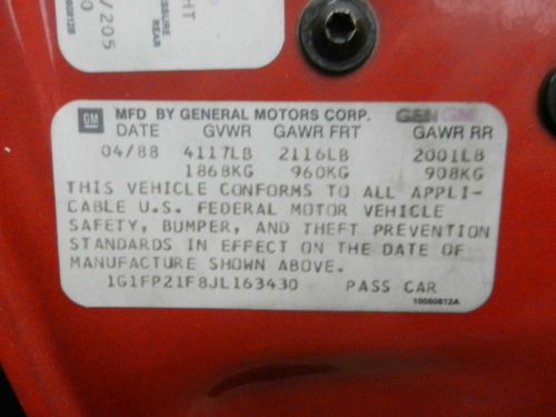 Available is a Stunning 1988 IROC-Z , desirable color combination and drivetrain. Car is a 305, 5.0L TPI, 5-speed. Vehicle Has 18,300 original miles. Deluxe cloth interior with just about all options. Red with a gray cloth interior, very original benchmark level car. 100% original paint, no accidents ever, no rust ever, Purchased 1 year ago when bought. Car looks as if has Never been driven in any foul weather and it has always been garaged. Yes, the car has the original "ink-mark-still-showing. Car has no stories, just a collector owned car since day 1. Currently on it's 3th owner. The following has been replaced over the last few years: Tires ( Only 3,000 miles on them), heater core, all fluids, plugs, wires, cap, rotor. The battery has been replaced also. Car is fun to drive and ALWAYS gets attention at cruise nights and car shows. If you want to get real critical, the car may have a very small ding or two that you need to climb all over it to find, but it's really, "really" nice car. They are only original once and thirdgen Camaros and Firebird with low mileage and the right options / colors are starting to skyrocket in value, they have recently been in the press about how they are great to collect as they are going up in value quickly. Buy this one to enjoy before the prices go nuts. I am posting for a very close friend, if you have any questions, you will need to get in touch with him direct (253) 569-4392. You are welcome to view the car if serious prior to making a bid. Serious bids only please!! Car is located in Auburn, WA., about 30 min. South from Seattle. If you do not have the funds, please do not bid. I reserve the right to cancel the auction at any time. $500 is due within 24 hours of auction close. The rest is due within 7 days, Bank wire / cash or certified bank check only. The car must be picked up within 14 days of auction close. The buyer is responsible for all shipping arrangements. Thanks! Keith (253) 569-4392 On Apr-28-14 at 21:54:21 PDT, seller added the following information: After being asked a few question, I will note, the car does have a few scuff/ scratches on the lower/bottom side of front bumper due to the fact it sits low to the ground, Please see photo's. |