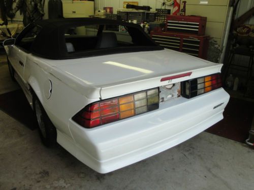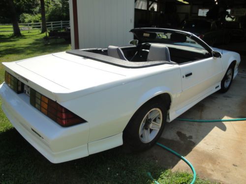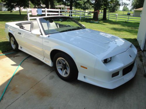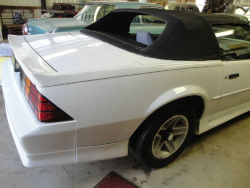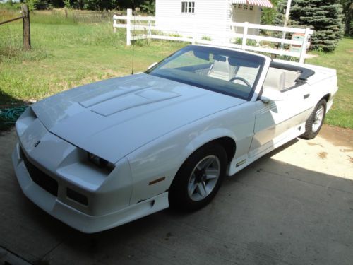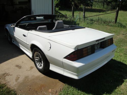 For sale: 1991 Chevy Camaro RS Convertible with factory ordered 3.1 liter V6 (231 cubic inch) motor, automatic overdrive transmission, factory convertible, air conditioning, power brakes and steering, cruise, and AM/FM cassette player. It is a two-owner car with 110,000 original miles on it – it is a great driver and is a model that you don’t see (700 made in 1991). Car comes with manual, new car cassette, original order sticker, and clear title. It is selling for a fair price with no reserve!***** BODY: Car has a white exterior, gray cloth interior and carpet, and a black convertible top. Paint is original and very nice driver quality except the front end was repainted due to chips (2 years ago), the hood was replaced with a fancier 1992 hood, and the ground effects on the bottom of the doors were repainted. The car presents well except for: the underside edge of the trunk lid is rusty and needs to be either replaced or cut out and patched (just on the underside – closes/locks fine), some slight surface rust around the wheel well opening, just on the lip, on the driver's side front and rear wheel openings, and there is a spot of rust under the spoiler on the driver's fender front and a slight blister under the mirror mount on the driver's door. Underside is clean and structurally sound. There are a couple of touched up scratches on the trunk, a couple of dings on the driver’s door, and some light spider age cracking on the rear bumper. Black convertible top is also original, it is in good shape, however the back plastic window is out of it and would either need to be re-sewn in (details on the internet on the kit/piece to buy and how to do it), or the top replaced or left as it is. Edge welting on the top shows some age cracking, but works fine and presents fine. This car has a manual top, it has an electrical switch to open the top well (switch is not working), but it does have a manual pull to open the well instead, and it works fine to raise and lower the top to/from storage. The front windshield is also new as it got a rock chip a year ago while driving and the interior is very nice except for some wear as shown on the driver’s seat. MECHANICAL: Car runs and shifts great – within the last year, the car has had a complete tune up and fluid change, new injectors, new EGR valve, a new fuel tank, fuel pump and sleeve, lines and sender (GM pieces), and new exhaust (Flowmaster). I have also had the brakes gone through – redone rotors up front with new pads, turned drums in rear with new shoes and new brake lines. Tires were purchased new and now have 10,000 miles on them (Goodyear Eagle P225-60s). Car has also had a new battery installed, a new drive belt, and new style headlights. Car honestly runs strong and correct with no issues – pretty amazing performance and fuel economy from this engine – love it with the top down in summer!***** TITLE: Car has a clear title in my name and will be signed off to new owner. PAYMENT: Paypal can be used to pay the $1000 deposit for the car within 3 days of the sale’s end. Balance is due within two weeks after that – either by cash at pickup or by bank wire transfer (call for bank, account, and bank contact details). If fully paid for up front, car can stay stored here for up to 30 days at no charge, after 30 days, I will refund all money, except the deposit, and relist the car. QUESTIONS: If questions contact Dr. Brian using the email link above and to the right in this ad that mentions “ask seller a question”. Car is located 1.5 hours south of Chicago, Illinois (zip 60970) and about 15-20 miles west of the Illinois/Indiana state line. We are in a rural area, so easy to find and easy access. Please feel free to come and view the car/drive it or send someone to do so. Contact me before coming so I can be sure to be here! Thanks for looking!!!*****