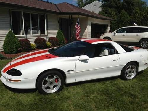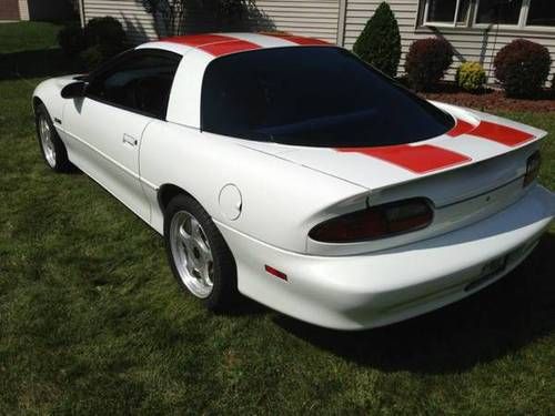 This is a Beautiful 1997 Camaro Z28 30th anniversary special edition! Car only has 84000 original miles. Paint and body are perfect! It is factory equipped with a (T-56) 6 speed manual transmission, white leather interior and the special edition ghost white paint job with orange stripes (RPO code Z4C). After market upgrades include; headers, K&N cold air intake, electric water pump, suspension, fully welded and tuned exhaust, wheels and tires and multi-disk CD changer. I just installed a bran new BAHNHOF stage 1 clutch and flywheel. This car is immaculate! Florida car so absolutely zero rust! Very fast a fun to drive! Comes with factory exhaust manifolds and Y-pipe and original suspension.
