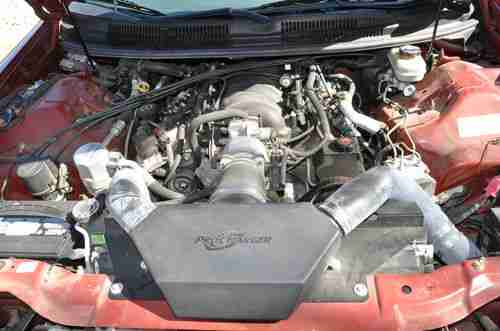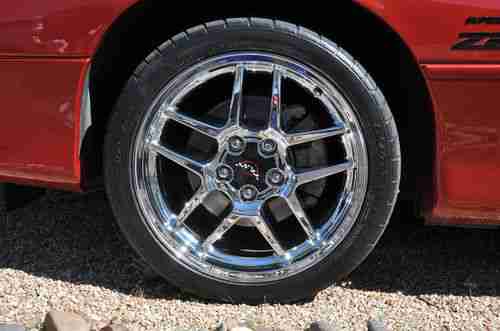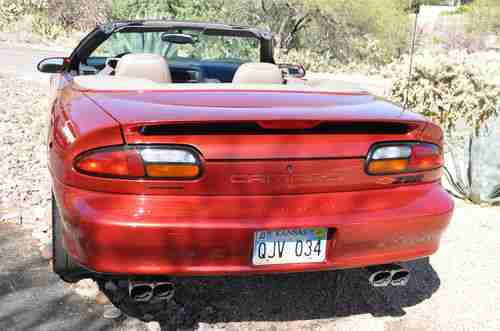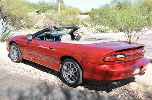 This may be the finest one owner low mileage fourth gen Camaros on the market today. $45,000 invested. This 1998 model year saw the LS1 Corvette motor introduced into the Camaro. Building on that, extras include the Procharger supercharger/dual intercooler system professionally installed by former Procharger personnel, Hooker headers, Borla stainless steel cat-back exhaust system, 18" C5 Corvette ZO6 chrome wheels all around, Nitto high performance tires and an MP3 hookup to listen to your iTunes. 35,000 on the odometer translates to 2,300 miles per year of recreational, always garaged ownership. This is a very fast street car putting out 411 rear wheel horsepower which translates to nearly 500 horsepower at the crankshaft. The six speed manual is a rare setup for the convertible model and, as a bonus, the "skip shift" feature has been taken care of. The Cayenne Red Metallic paint, offset with the Natural color fabric top, is bright and beautiful. I know from personal experience this car gives up nothing in acceleration to a C6 Corvette, and with the 275 front, 285 rear Nittos it's eager in the curves as well. A bargain at the "Buy It Now" price!