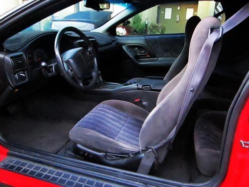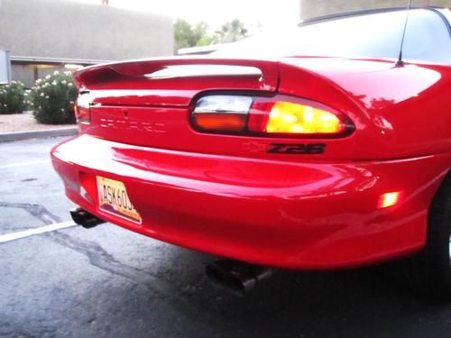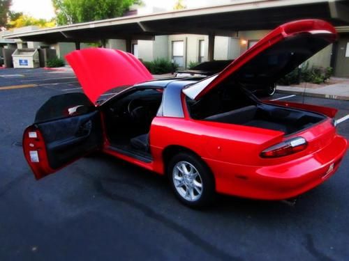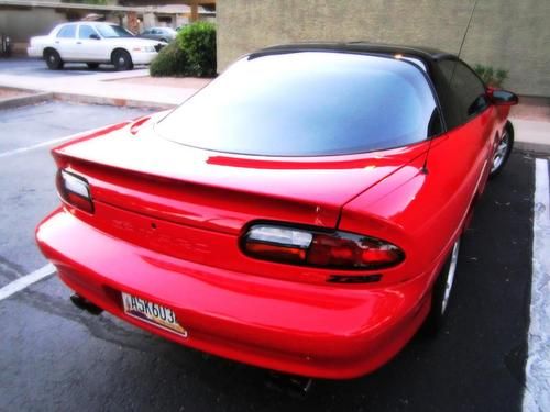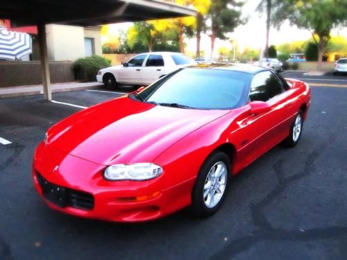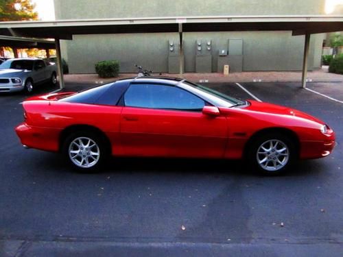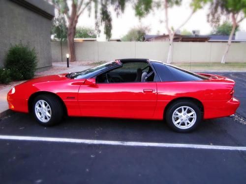 THIS IS A NO RESERVE AUCTION!!!! Selling this beautiful red Camaro Z28 LS1 V8 THAT RUNS STRONG AND VERY RESPONISVE. The car very clean, great looker and completely fun to drive. Its mostly original except for the exhaust. It has a Borla exhaust that sound pretty throaty. This car does not have any mods what so ever so you know it hasn't been beat up, its been well taken care of. The interior is a charcoal grey cloth and near PERFECT inside. The body on this car is completely straight no dents at all. The red paint really pops and looks great some chips here and there but it is a 13 year old car. This Car has ONLY 98K Miles on it! That comes out to about 7.5k a year. The Nations average is 15k a year and must likely more here in Arizona. You have to come and see, hear and drive this car. You wont be disappointed at all! PASSED EMISSIONS A COUPLE WEEKS AGO and no smoke! Minor chips and dings! This car is perfect MUSCLE car for you to do what you want to do with it! Its an automatic trans, has power doors and locks, keyless remote, cd player, power seats, T-TOPS and front side air bags. KBB THIS CAR BOOKS OUT FOR OVER $7,000 IN GOOD CONDITION!!! The car has a few dings and scratches and tires are about 50%, only minor cosmetics that is wrong with this car its in GREAT CONDITION FOR THE YEAR!!! Don't miss out on this car!!! if you have any questions or want to see it you can reach me at 480-200-7824 or 480-772-0901