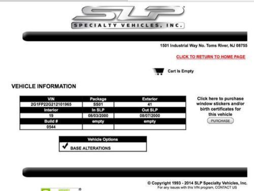 2001 Black Camaro Z28 High Performance SS package from SLP This Camaro SS is pristine and garage kept 24/7, it has never been in any rain, snow or inclement weather. It is always stored in my garage covered and on a Battery Tender. Everything works on this car and needs nothing. The A/C even blows ice cold! I'm so confident in the car that it could be driven anywhere anytime maintenance-free I've had no issues at all with it. Any and all maintenance was done by me I don't trust anybody else that's why I've done everything myself. The car does not leak any oil any fluids and maintenance is done regularly.