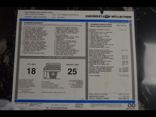I am the second owner of this car, the first owner was an elderly fellow from Idaho that took excellent care of it. The car was bought with all options (see photo of window sticker for description). I have had the car for about three years and it has been a great car with no problems. Original window sticker was $29,685 as this was a heavily optioned car. - The car also has a factory GM 3.73 rear end that we swapped from my uncles 17,000 mile Camaro SS. The original rear end was in great shape but we swapped the rear end with a upgraded differential cover when my Uncle went to a Ford 9". The car has been adult driven and not abused at all. Always garage kept. My feedback score is 100% with over 450 transactions so I will treat you honestly and fairly. On May-19-14 at 06:10:57 PDT, seller added the following information: Very Low Original Miles. Hard to find a 4th Gen Camaro in this great of condition with this low of mileage. |
