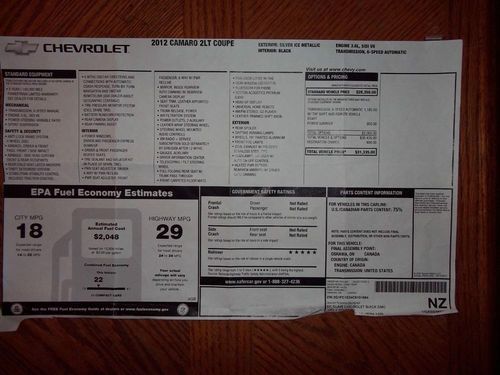 Your invited to bid on this gorgeous Cherolet Camaro 2012 2LT. Very low reserve. Owned by the original 72 year old Grandfather, the original and only owner. The Camaro is flawless and looks as good as the day it came home from the dealer. This is a non-smoking, garage stored, never seen rain or snow beaut. Complete maintenance records (consisting of one oil change and a detailing, performed by the Chevy Dealer). The Camaro has custom one of a kind racing decals and pinstriping. This Camaro is nearly flawless. Not a mark, scratch or blemish on it. Balance of Factory 36 month/36000 mile bumper to bumper Warranty and 10 year, 100000 Drive train warranty.