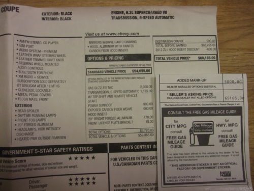 Like new condition and only 1,400 miles. Deep Gloss Black paint on Black leather and suede interior with red stitching. Magnetic Suspension, 580 horsepower, 556 torque and sticky Eagle F1 rubber. If you are looking at this ad you probably know something about the ZL1 which comes standard with tons of high performance and track ready features. This one comes with the following OPTIONAL equipment as well: Smoke free, no issues, no accidents, no paint work. This car comes with the original window sticker, both key fobs, manuals and original paperwork, just like a new one. On Mar-16-14 at 03:23:50 PDT, seller added the following information: Updates: On Mar-16-14 at 12:47:43 PDT, seller added the following information: NOTE TO BIDDERS: YOU ARE GETTING VERY VERY CLOSE TO THE RESERVE PRICE!!! JUST A LITTLE MORE AND THIS CAR WILL BE SOLD! THANK YOU FOR YOUR INTEREST IN MY CAR...YOU WILL NOT BE DISAPPOINTED! |
