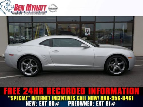 LT trim. JUST REPRICED FROM $26,976, $3,700 below Kelley Blue Book! CARFAX 1-Owner, Excellent Condition, LOW MILES - 16,294! Heated Leather Seats, Back-Up Camera, Head Airbag, Premium Sound System, Onboard Communications System CLICK NOW!======EXCELLENT SAFETY FOR YOUR FAMILY: Electronic Stability Control, 4-Wheel ABS, Tire Pressure Monitoring System, 4-Wheel Disc Brakes Safety equipment includes Electronic Stability Control LT with Silver Ice Metallic exterior and Gray interior features a V6 Cylinder Engine with 323 HP at 6800 RPM*. ======EXCELLENT VALUE: Reduced from $26, 976. This Camaro is priced $3, 700 below Kelley Blue Book. ======VEHICLE FEATURES ~~~: Rear Spoiler, MP3 Player, Remote Trunk Release, Steering Wheel Controls, Heated Mirrors. ======OPTION PACKAGES: RS PACKAGE includes (R42) 20 x 8 front and 20 x 9 rear flangeless, painted aluminum wheels with Midnight Silver finish, (BD8) body-color roof ditch molding and (T4F) high intensity discharge headlamps; shark-fin antenna is body-color, TRANSMISSION, 6-SPEED AUTOMATIC includes TAPshift manual shift controls on steering wheel, 2LT PREFERRED EQUIPMENT GROUP includes Standard Equipment, REMOTE VEHICLE STARTER SYSTEM includes Remote Keyless Entry, ENGINE, 3.6L SIDI DOHC V6 VVT (323 hp [240.8 kW] @ 6800 rpm, 278 lb-ft of torque [375.3 N-m] @ 4800 rpm) (STD). ONE OWNER LOCAL TRADE IN. ======EXPERTS CONCLUDE: CarAndDriver.com's review says Superhero design, modern and refined chassis, strong brakes, surprising V-6 power.. ======WHO WE ARE: Visit us Today! Dealer Award Winner for outstanding sales and service in the Charlotte region. We are one of North Carolina's Largest Certified Nissan Dealers. Our team is professional Pricing analysis performed on 6/16/2014. Horsepower calculations based on trim engine configuration. Please confirm the accuracy of the included equipment by calling us prior to purchase.