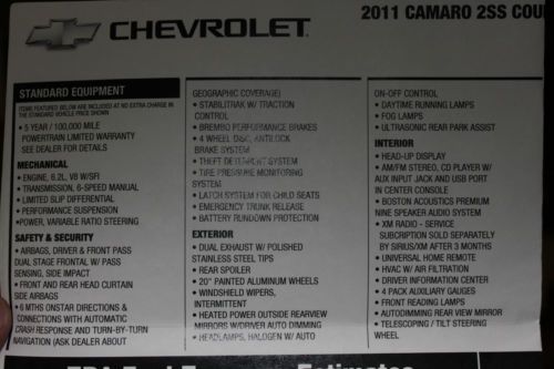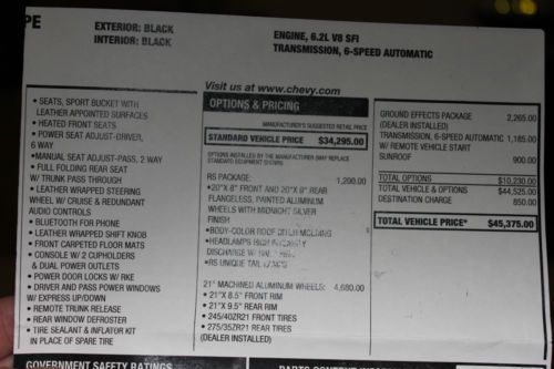 Price Reduced! This is a 2011 Camaro 2SS/RS. Sticker price was $45,000+. It has less than 13,000 miles and has feature available as far as I know including; sunroof, ground effects, custom spoiler, 21" custom wheel tire package, Power heated seats, tinted windows, leather seats, automatic transmission, 400HP V8, heads up display, paddle shifter, halogen headlights and probably more. I would be happy to answer questions, just send me an ema |