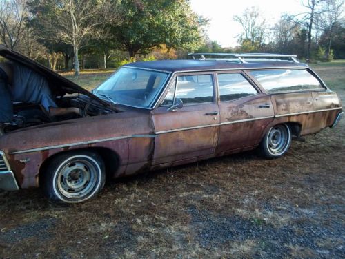 You are bidding on 1967 Bel Air station wagon that will be sold with a bill of sale. I can get a title extra ($150). The car was own by a buddies mom which she is the original owner. The the car came with tilt steering wheel, Am Radio, Power steering with Manual brakes and Luggage rack. Motor is a 283/ 2 speed powerglide transmission that runs and drive. The car will need Hood and tires. The tires that are on the car now does hold air making it long not well for long distance. The body is not full of bondo or rot but its a Rat Rod look. The trunk area has 2 or 3 spots, Driver and Passenger front floors rust has formed near the drain plug, Back floors are nice. Interior is leather with great cushion but needs rewrapped. Lower driver 1/4 needs some attention. The tailgate area is super nice and solid. The back window is hand crank that goes up and down. All the door, shut tight like new. There are no rust or rot underneath doors. All glass and chrome is there. Nothing is missing. I have a video of car if interested. Everything lights up and work as from the factory Yes Everything.