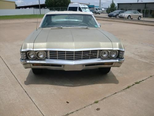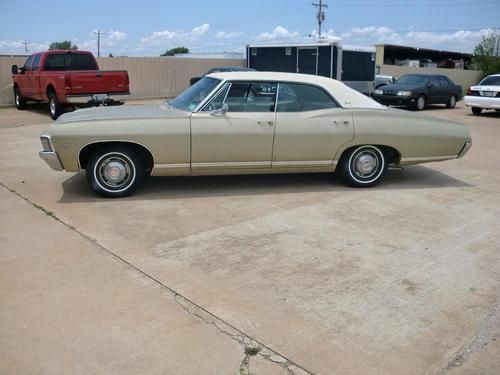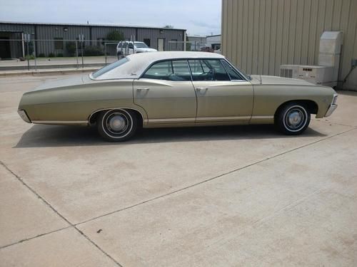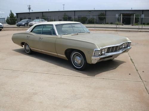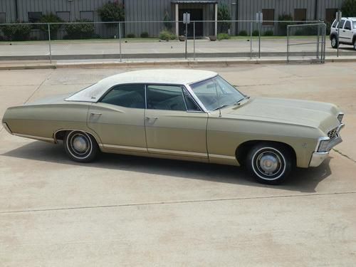 FOR SALE AT "NO RESERVE!!!" IS A IS A "ONE FAMILY OWNER" 1967 CHEVY CAPRICE 4 DOOR HOT ROD! ONLY 86,115 ACTUAL MILES. THIS CAR HAS THE HIGHER H.P., CLOSED CHAMBERED,"CAMEL HUMP HEAD", 4 BBL, 327 C.I., V8 USUALLY FOUND IN THE 2 DOOR CARS. THE OWNERS GRANDFATHER ORDER THIS CAR NEW. IT IS LOADED WITH POWER BRAKES, POWER STEERING AND FACTORY A/C. THE AIR DOES NOT BLOW COLD. THEY HAVE KEPT IT IN HIS FAMILY ALL THESE YEARS KEEPING UP WITH ALL THE MECHANICAL MAINTENCE. THE CAR HAS A NEW BATTERY, NEW TIRES & COMPLETE NEW EXHAUST. THE CAR HAS BEEN MOSTLY SITTING FOR THE PAST 3-4 YEARS WHILE GRANDSON WAS AT COLLEGE. IT WAS STARTED & MOVED EVERY FEW MONTHS.