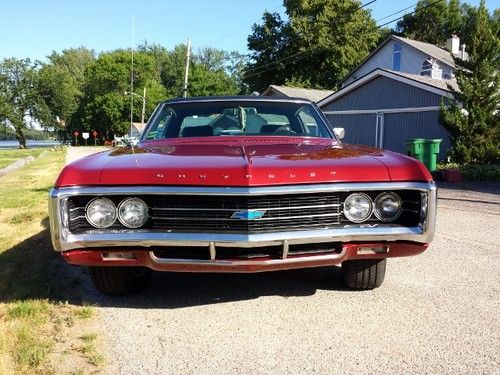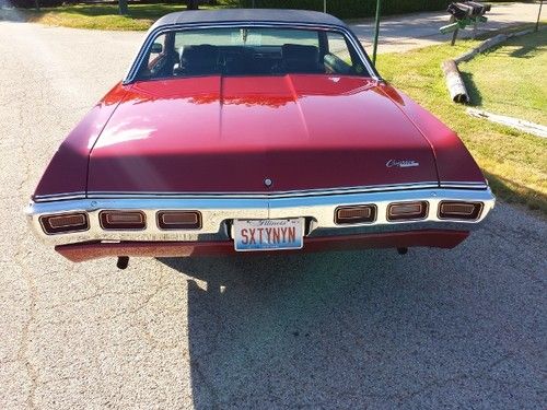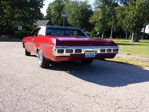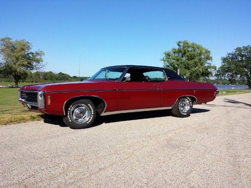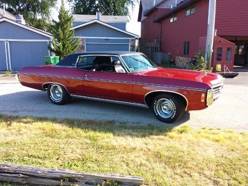 Up for sale...1969 Chevy Caprice Custom Coupe never seen rain or snow since restoration. Has been garaged for 30+yrs. 350 Turbo Fire bored .30 over makes it a 355....Edelbrock intake w fresh rebuilt Rochester QuadraJet, TRW Pistons w Chromoly rings, double roller timing chain, mild cam w Rhodes semi hydraulic lifters, Melling high volume oil pump, new harmonic balancer, COLD A/C w new compressor, electronic ignition, turbo 350, 12 bolt posi w 3.73 gears, dual exhaust, new upper and lower ball joints, all new polyurethane bushings all around including body to frame bushings, new Chevy Rally wheels w brand new Cooper Cobra tires, New interior sound deadening kit, new "Body by Fisher" rocker sill plates, new fuel sending unit, jammin stereo w amplified speakers(not hacked up), Pearl Red w black vinyl top, BEEN IN THE FAMILY SINCE 1980!!!!!, Hate to sell but need a change...really want a new Challenger. Almost mint show car. Turn heads everywhere it goes, really is a beautiful car! Also have spare parts that go with the car(full set of glass minus windshield, front bumper,misc.trim and parts)Please feel free to contact me with any questions or concerns. First time listing anything so cut me some slack.