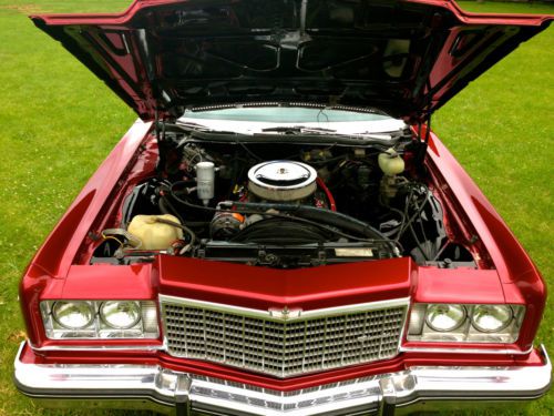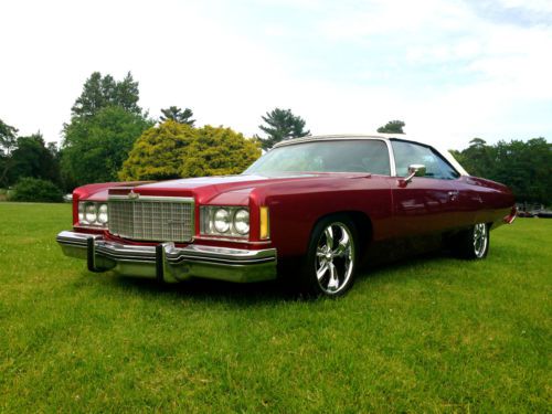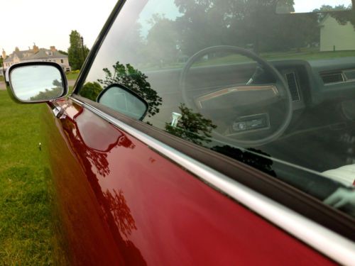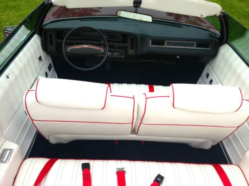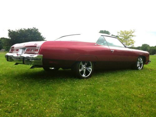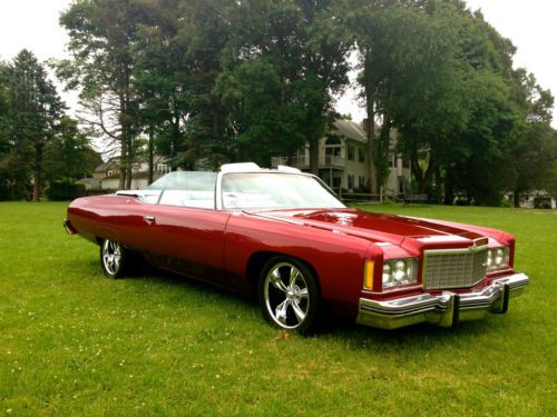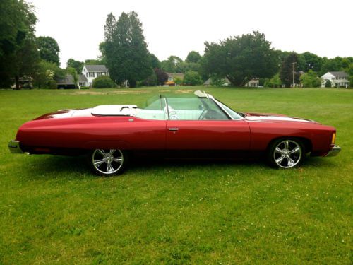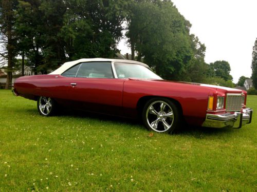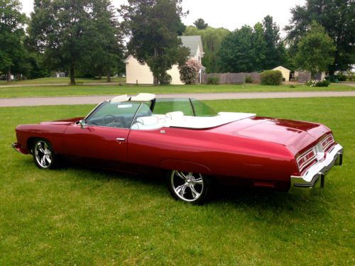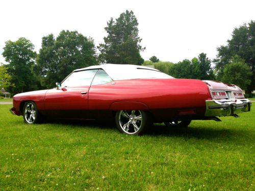 For sale is a 1974 Chevrolet Caprice Convertible with absolutely NO issues at all and its exactly what you would expect a car of this Caliber to Drive & Feel like its got Tons of Power, Appeal, and Comfort like NO other. Its truly a show stopper and i mean it really stops Traffic! you will be hard pressed to find another spacemen or breed of this kind. The Interior is All Custom the color combo that was used was Soft White Leather with Red Stitching/Piping the dash is original with 0 cracks and in perfect condition also equipped is custom sound system that sound amazing. The Exterior of the car is a Candy Color Ruby Red and Laser straight with No Dings, Dents Or Rust, On, Around, Or Under the car anywhere, all Power windows Work, Top is New and functions correctly, A/C is cold and works, moldings, Gaskets, and trim pieces, are all new or in new condition nothing was left undone or over looked every nook & cranny, bolt and washer, was replaced if needed. This Caprice is Very tight, the new shocks and springs have it sitting pretty. The motor and trans have less than 500 miles and the 5.7L Engine was bought New from a local Chevrolet Dealer Also bought New were Starter, Radiator, A/C Condenser, Water Pump, Power Steering, New complete custom exhaust with Headers, and the List go's on. All Service Records, and Receipts will go with car when sold. Remember NO trades or financing available please have your funds in order prior to bidding. Thank you & good luck