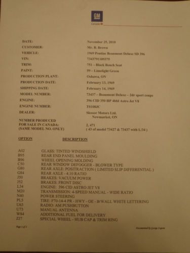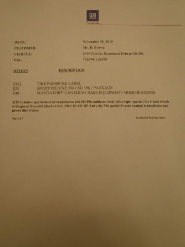 This ultra rare 1969 Beaumont SD-396 is the real deal! GM of Canada Documentation proves that only 43 of these cars were ever produced from the factory with the top of the line 396-350 HP.(375 HP was not offered in the beaumont) This is a non # matching early 396 with a tremec 5 speed transmission with the original "KK" code 4:10 12 bolt posi rear end, new headers & exhaust system,(underdash gauges not included). The body & paint are in decent shape, floors & truck pans have been replaced, the paint colour is lime light or frost green (code 59).with the correct SD stripe The interior seats & door panels are redone with the correct material from SMS in Ohio cloth & vinyl (code 751) headliner is original and in decent shape the dash has cracks but comes with a new cap, the rubber floor mat is new reproduction. The Beaumont Deluxe SD396 would be the same line as a chevelle 300 SS396 series this is not a show car it's driver quality, email any questions. Buyer responsible for pick up. $500.00 non-refundable deposit with in 48 hrs of auction.