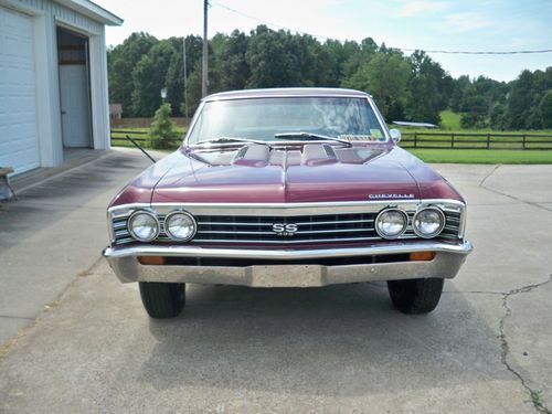 This is a very nice 1967 Chevelle SS. Car is true 138 SS car. Not a clone. Car is 396/325 HP with 4 speed manual transmission. Car has 9 year old off frame restoration with aluminum exhaust, 12 bolt main rearend, rally wheels with coker tires, gauge package dash, am/fm slide bar radio, correct radiator, deluxe set belts, and a Teak 3 spoke tilt steering wheel. Car is very nice and as clean underneath and on top. Contact with more info or would like to see addition pics. (704) 528-9595