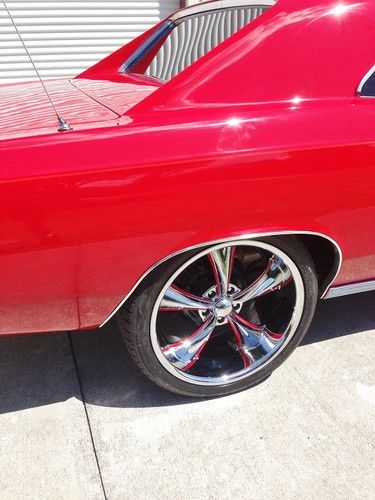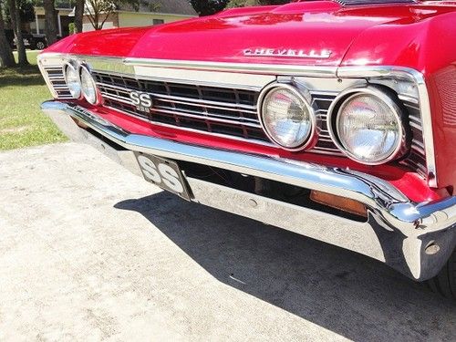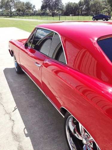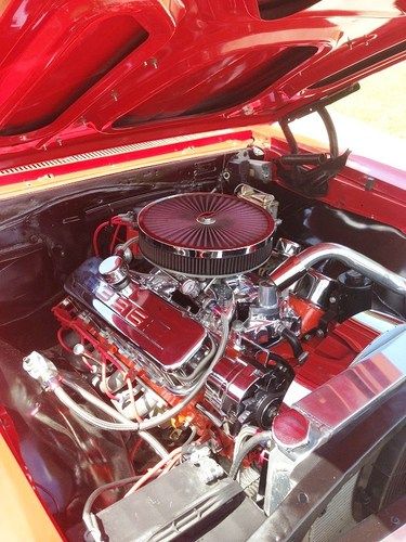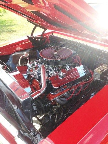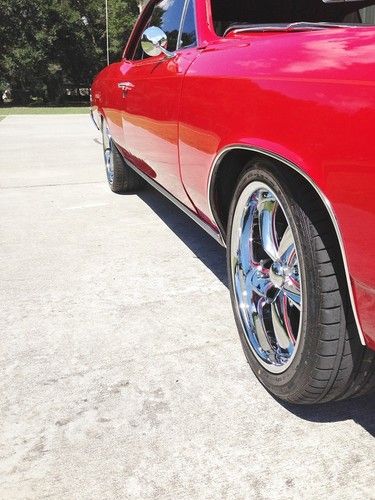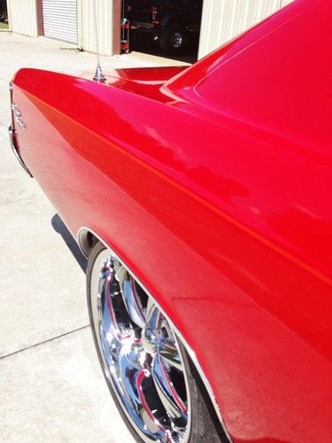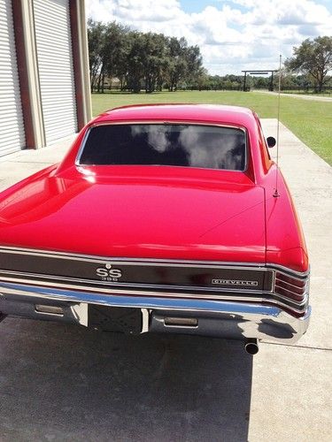 This 1967 Chevelle has been totally restored as a SS. It has a big block built 468CI engine with 425HP high performance turbo 400 transmission and 3:55 posi rear end. It has disc brakes, power steering, bucket seats console, complete SS gauge package, aluminum radiator, electric fan, ceramic coated headers, dual exhaust Flowmasters, highly detailed engine compartment with nice billet and chrome accessories. The paint and body is really nice bright red with black interior. The wheels are 18 & 20 inch Boss triple chromes. This car has an awesome stance, a really nice powerful motor. It runs and drives as good as it looks and is a blast to take out and enjoy.