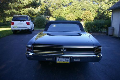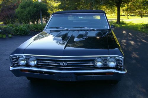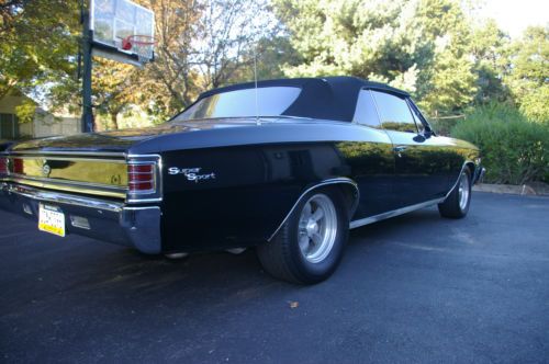 THIS IS A TRUE SS 138 VIN, CONVERTIBLE TRIPLE BLACK. RARE FACTORY AIR CONDITIONING, RARE HEAD RESTS, TILT WHEEL, POWER DISC BRAKES, POWER STEERING, POWER TOP, POWER WINDOWS, BLINKER TACH, OIL GAUGE, TEMP GAUGE, CENTER CONSOLE WITH CLOCK, 373 12 BOLT POSI WITH FACTORY BOXED CONTROL ARMS(ORIGINAL TO CAR). NON MATCHING #S ENGINE AND TRANS. HAS A 496 STROKER WITH AN ART CARR 700R4 TRANS WITH ELECTRONIC OVERDRIVE, 3 INCH EXHAUST, CRUISE AT 70 ALL DAY. PAINT IS STUNNING. BODY AND INTERIOR ABOUT FLAWLESS. TOP IS BEAUTIFUL. THIS CAR CAME FROM NEW MEXICO. DROP DEAD AWESOME CAR !!! FORGOT TO MENTION THAT I ALSO HAVE THE GM 67 RALLY RIMS, CAPS AND CONES, ALSO IN FANTASTIC CONDITION.