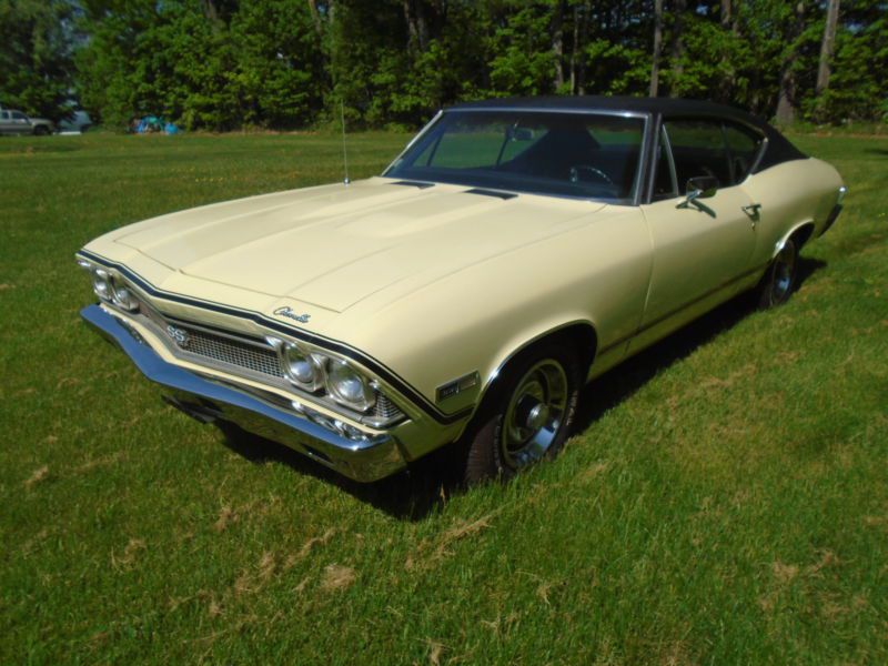 1968 Chevelle SS (138 VIN CODE) matching number fresh total rebuild 396, buckets, console, 400 turbo automatic 12 bolt rear. Floors, floor braces, trunk, frame and body nice, no rust.... Also new vinyl top, bumpers, full interior, handles, emblems, tires, exhaust, all new rubbers,new engine and light wire harness, and more... Factory power steering, power disc brakes gone thru, butternut yellow, SS stripes, black vinyl top, all original factory colors....... Car has no miles on the correct matching 396 engine, nice clean driver.