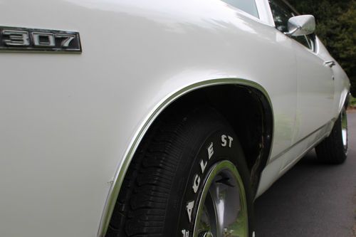 VIN: 1363379z362778 and the VIN plate matches the title. History: I can't tell you much about the history. The car came from a friend that lives near Cincinnati, Ohio. The car was thought to have come from Mississippi to the southern Ohio area. It sure looks like a deep south car, the underside has no under coating, I think the floors are original and look very good. MILEAGE: 70,495 reading and who really knows. UP FRONT discloser and time saver!!!!!!!!!! This is a good looking car, it is solid, it drives and stops good, it has clear glass and decent chrome, the engine runs good and the transmission shifts good. Its just a super nice drive and enjoy quality car. I love the silver stripes on the white paint and the paint is decent, some touched up chips mostly on edges and seems. The wheels are GM Rallies and the tires good Goodyear Eagles. Most stuff works on the car. WHO YOU ARE BUYING FROM: My name is Ron Watson and I live in the small town of WILL I SELL THE CAR OFF EBAY MOTORS? Yes, I'm not crazy, I know the most of you are not registered on ebay and use it as a research tool. MY REAL PRICE IS $13,950!!!! That's what it take to buy the car on or off ebay motors, you dealers wanting to resell have to pay the same. I have been doing this for a long time and I know the game, I don't play it the same as most and I sell every car I put for sell. PLEASE NO TRADES!!!!!!!!!!!!! Thank you, but I will not trade, why should I trade when I have a hot selling car, I don't need motor cycles, boats, jewelry or your used false teeth. I DO NOT SHOW CARS ON SUNDAY!!!!! I worship on sunday, I spend time with my family and I rest. I'm doing this because I love it, "I need a day off". I will be happy to show you cars 6 days a week, call in advance to set up a time, "I'm 66 years old and life is more than just cars". Sorry, but I do not do videos. I'm old and don't want to learn and mess with them, I sell my cars anyway. IS THERE ANY RUST PROBLEMS? This is no rust bucket, the underside looks good, but not sanded smooth and detailed for show. The frame, supports and bottom panels all look very good to me. The car has never had under coating so you can see what your looking at, some rusty color metal and pits, but very solid. You will not find many as good as this on the underside. IS THERE ANY ACCIDENT DAMAGE? None that I can find and the title states none. WHY AM I SELLING THIS CAR? I’m a retired mechanic/auto-mechanic instructor/was a Army helicopter mechanic and instructor. When I find a truck or car I like for a good price I buy it fix things and resell for a fair profit. I did not restore this car, I just fixed a few things. IS THIS A MATCHING NUMBERS CAR? I don't know, the engine has been rebuilt and upgraded to 4 barrel carburetor, the exhaust is ungraded to duals, the car was born a air conditioned are, it now just has the inside stuff. PAINT: I would consider the white paint with silver stripes good, but not perfect, the car is straight when you look down the sides, it has no rust bubbles, no big dents, but a couple of minor dings that have not broken the paint. Several chips have been touched up, mostly on edges and in seems. CHROME: The back bumper is very good, the front bumper has a little ding and several dull places (a new one cost about $200), the window stainless good, the drip rail molding has a large scuff on the drivers side. INTERIOR: No smoke smell, the seat covers are good, the carpet good, the door panels good, the headliner very good, the dash pad has cracks. RADIO: A very good sound system, its a Kenwood AM/FM CD player with 6x9 speaker in the back package tray area and a big woofer in the trunk. UNSERSIDE: Solid, but not painted shinny to put mirrors under at the car show. Its not a rust bucket, the frame extensions and supports look good as wheel as the body mounts. It has never been under coated so you can see what it really is. GLASS: The side glasses roll up and down good, the windshield good, but has a faint wiper mark on the passengers side. ENGINE: Engine runs very good, its a 307 cubic inch that has been rebuilt. It runs as strong as 350 engines and has no knocks or blue smoke. It has a Edlebrock 4 barrel carburetor and the hoses and belts good. EXHAUST SYSTEM: Dual exhaust, not new but good, stock manifolds. TRANSMISSION: Its a Turbo 350 that shifts good. REAR-END: It has no bearing noises, no growls, its a 10 bolt, I have not checked the gearing, but its just right, you can drive it on the road, it no crazy low ratio. BRAKES: Good with a power booster. STEERING: The cars drives very good, it is power steering. WHEELS AND TIRES: 15 inch Rally wheels with good Goodyear Eagle tires. LIGHTS: They work, turn signals work, headlights work, tail lights work, brake lights work, dome light works. GUAGES: Gas gauge works and the others are lights. WIPERS WORK! SPEEDOMETER WORKS! THIS CAR WAS BORN WITH AIR CONDITIONING: The inside stuff is still in the car, the compressor and condenser under the hood are gone. If you want air just put a modern compressor on. HOW DO THE DOORS AND HOOD OPEN AND CLOSE and panel fit? I think the doors fit and open very good, the hood and trunk fit good. WOULD I DRIVE THE CAR HOME ON A LONG TRIP: I never recommend driving a old car home, I just test drive them and drive them some around town, but I do think this car would drive anywhere. DID I RESTORE THIS CAR? No! GOOD STUFF: The body is as good as your going to find, stuff works on the car, it runs good, it stops good, it drives good, it looks good. BAD STUFF: If I was going to keep the car for my own here is what I would do. I would put a new front bumper on, I would replace the drivers drip rail molding, new drivers mirror, new dash pad. Later on I would add a modern air conditioning system on the under hood part. Its just a nice driver, its not perfect::: front bumper dull, drip rail molding scuffed, minor wiper mark on passengers side of windshield, crack in dash pad, few pits in marker light b