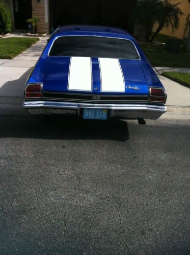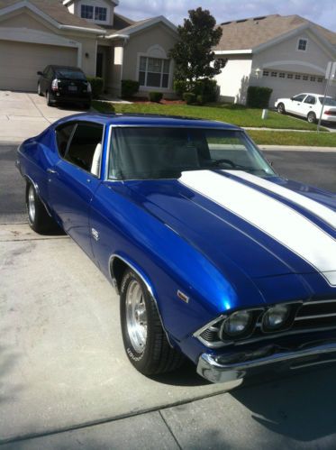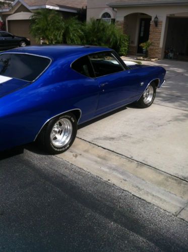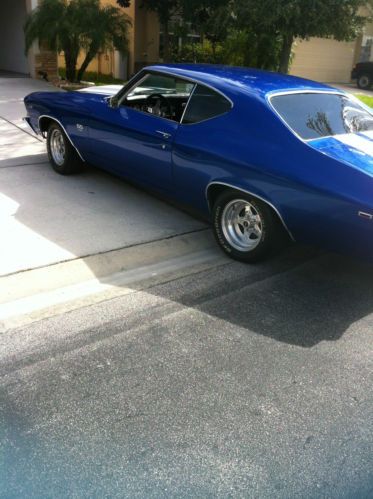 1969 CHEVELLE SS 396 0.30 OVER BLOCK, 11 TO 1 PISTONS WITH OVER 450 HP. CRANE CAM 292-304 DURATION,510 -527 LIFT,CAM GEAR,EDELBROCK INTAKE HOLLEY 750 DOUBLE PUMPER CARB. HEADS ARE PORTED AND POHLISHED.HEADS AND EXHAUST PORT TO MATCH. ELECTRIC IGNITION WITH MSD BOX. AUTOMATIC TRANS 700R WITH OVERDRIVE, 12 BOLT REAR WITH 411 GEARS. TUBULAR FRONT UPPER/LOWER CONTROL ARMS, WITH OVER SIZED FRONT/REAR SWAY BAR, SLOTTED/CROSSED DRILLED ROTORS WITH DUAL PISTON CALIPERS (FRONT). NEW FENDERS BY GM, NEW FLOOR PANS INCLUDING TRUNK. VEH HAS FRESH PAINT VIPER METALLIC BLUE WITH PEARL WHITE STRIPES . ONLY BLEM IN PAINT IS A SMALL BUBBLING SPOT NEAR DRIP RAIL AS SEEN IN PIC. NEW INTERIOR IN GM PARCHMENT WHITE, HAS CAMARO FRONT SEATS CUSTOM MADE TO MATCH INTERIOR OF VEHICLE. FACTORY SEATS INCLUDE WITH CAR SALE. AM/FM CD PLAYER WITH 4 SPEAKERS AND COVANS DASH CLUSTER ASSEMBLY WITH GUAGES. HAS STEEL COWEL HOOD AND ORIGINAL FACTORY SS HOOD. NEW WELD RIMS 275 REAR AND 235 FRONT. THIS VEHICLE HAS BEEN REBUILT BUMPER TO BUMPER WITH NO EXPENSE SPARED.VEHICLE RUNS AND DRIVES GREAT. |