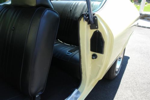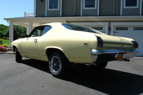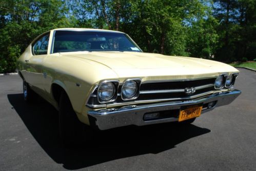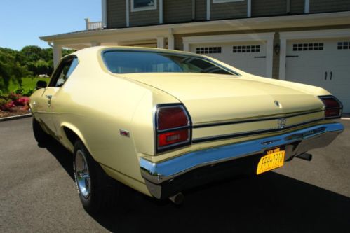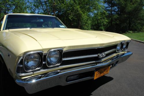 1969 was the first year that the SS came as an option package instead of a separate model. This real matching numbers 69 Chevelle SS has been treated to a complete 2year frame-off restoration. More than 300 pictures document this incredible restoration from beginning to end. Every nut and bolt has been replaced using original or OEM parts. New paint in its original Butternut Yellow (paint code 40) and black vinyl interior look flawless. Documentation includes original data cards (not very legible), owners manual and a 2" file full of receipts from the restoration.