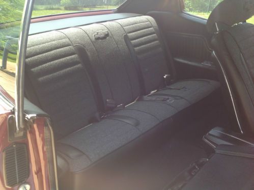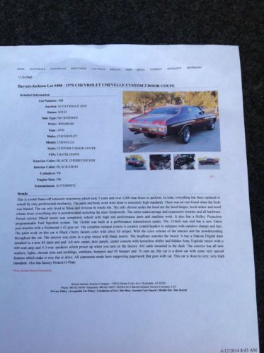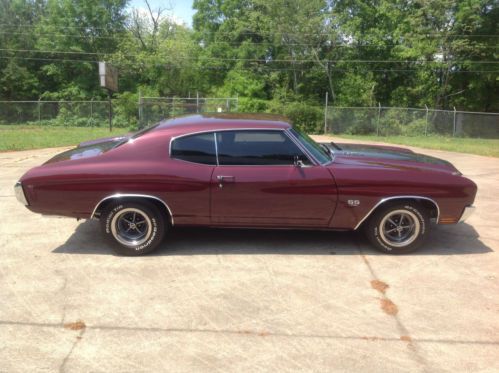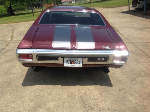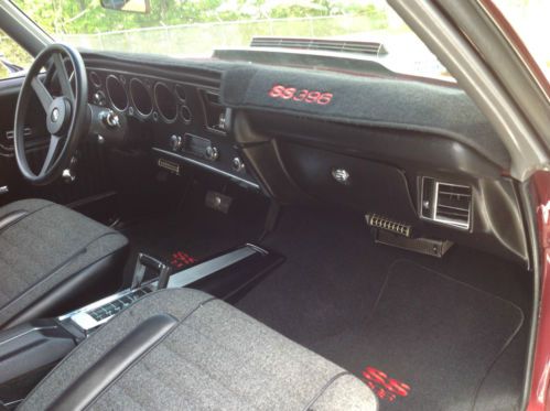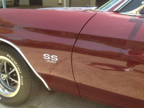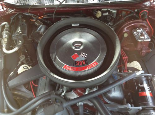 This is a no expense spared, total frame-off rotisserie restoration which took 5 years and over 2,000 man hours to perform. In total, everything has been replaced or rebuilt by only professional mechanics. The paint and body work were done to extremely high standards. There was no rust found when the body was blasted. The car only lived in Texas and Arizona its whole life. The only chrome under the hood are the hood hinges, hood striker and hood release lever, everything else is powdercoated including the inner fenderwells. The entire undercarriage and suspension systems and all hardware. Period correct 396cid motor was completely rebuilt with high end performance parts and machine work. It also has a Holley Projection programmable Fuel Injection system. The TH400 was built at a performance transmission center. The 12-bolt rear end has a new Eaton posi-traction with a Richmond 3.42 gear set. The complete exhaust system is ceramic coated headers to tailpipes with stainless clamps and tips. The paint work on this car is Black Cherry factory color with silver SS stripes. With the color scheme of the interior and the powdercoating throughout the car. The interior was done in a gray tweed with black inserts. The headliner matches the tweed. It has a Dakota Digital dash installed in a new SS dash and pad. All new carpet, door panels, center console with horseshoe shifter and hidden Sony Explode stereo with a 600-watt amp and 4 3-way speakers which power up when you turn on the factory AM radio mounted in the dash. The exterior has all new markers, lights, chrome trim and moldings, emblems, bumpers and SS bumper pad. To sum up, this car is a show car with some very special features which make it very fun to drive. All statements made have supporting paperwork that goes with car. This car is done to very, very high standards. Also has factory Protect-O-Plate. Definitely trailer queen material but this car was built to drive. Fuel injection and working gauges make this car fun to drive !! This car sold at Barrett Jackson in 2010 for $50,600.00. View link for details - http://www.barrett-jackson.com/application/onlinesubmission/lotdetails.aspx?ln=408&aid=304 For additional video http://s767.photobucket.com/user/LADBIGG/library/CHEVELLE |
