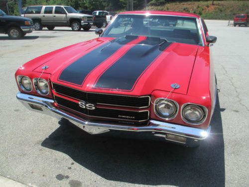 1970 SS CHEVELLE RED BLACK INTERIOR. RESTORED INSIDE OUT. HAS 1968 396 BUILT TO 375 HP. TURBO 400 TRANS. POWERSTEERING AN BRAKES. PAINT IS EXCELLANT. INTERIOR IS ALL NEW. 12BOLT REAR DISC BRAKES FRONT.BOX CONTROL ARMS.SWAY BAR.F-41.SUS.BUCKET SEAT CONSOLE.IN GREAT CONDITION.TILT WHEEL. BUMPERS RUBBERS AN WEATHERSTRIP ALL NEW.BOTTOM OF CAR IS NICE AS TOP.NEW 17 BY NINE REAR AN 17 BY 8 FRONT TIRES AN WHEELS.ALSO HAS COWL INDUCTION.SOLD WITH GA REGESTRATION AN BILL OF SALE.CALL 770 535 7311