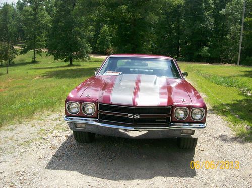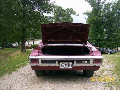 First off, is it a real SS? Who knows, I don't have paper work on this car from the factory and there is no other way to tell that I know of. The engine is a 73 so that's not original for sure plus I know where the engine came from. When I got the car it had the SS fender emblems but since it had a 454 engine, and someone I know had the 454 emblems new, so I used them. It does have a lot of SS items on it such as the dash. Same on the mileage, it shows 53,500 but who know. Now for what I do know, this is a very good driver quality car in looks and performance ready for everyday use. Very little signs of rust, I had the lower section of both front fenders repaired and painted. On the lip of the trunk there has been some repair also. The rear quarters appear to be original and still have the vin number stamped in them. There is some spots on the hood like something was splattered on it, it dont show up on the stripes but on the body color, they might be wet sanded out, not sure, I should have had them touched up when I had the fenders done but didn't really think it looks that bad especially with a good coat of wax. I took a picture of hood area and there is not much wax on the car now so they should show up. There is also some other scratches that need to be touched up but normal stuff from driving and using. All in all a very presentable driver quality car. As for the interior I am sure most of it has been replaced, console has not been and has some scratches, no radio in the dash, ac control is in the dash but looks bad. Speedometer and gas gage works but has aftermarket gages for oil and water. Worse place on the interior is the edge of the rear side panel is wore off like someone got in and out of the back seat a lot or possible rubbed by driver. Has all the front belts and some of the back. Very good driver quality interior. As for the mechanical there is no know big issues, most of the ac equiptment is gone and one of the previous owners said they were getting ready to put a aftermarket system in it. That's probably the best way to go if you want ac. The engine is a 73 model 454 with 781 heads. It had a stock rebuild with maybe a torque cam. Its .020 over and has flat top stock pistons and internals with a .010/.010 crank. I added a high volume oil pump, reworked valve springs, and Howards cam with .525 lift. Engine was to mild for a muscle car. It sound great now with a good thump, works with 2000 street rod converter and is very drivable. Other engine improvments are a aluminum intake and good working 750 vac sec Holley carb. Most of the engine accessories are new, water pump, alternator, fuel pump, radiator, dist, plugs, wires, etc. Oil just changed and is ready to go. I don't know much about the turbo 400 but it has been modified some and works good, does not have the kick down hooked up so its better to manually shift it but you don't have to. Same on rear end, its a 12 bolt posi with 373 gears is what I was told and that appears to be correct, if anything a little higher like 3.55. Its good for cruising the highway. Has headers with dual flowmasters ending at rear axle, should have tail pipes but I like it. I have to many cars so I priced it reasonable for a cash sell but I might do some trading. Tri 5 Chevy straight axle gasser or other gassers would be on top of the list. I would listen to anything on a part trade. I just bought a 55 chevy to build a street car from but if the right think came along I could sell it. I check my emails often so anything you want to know I will be glad to answer by email or I will call you if you prefer. I can deliver with in a couple hundred miles of north central Arkansas and can arrange delivery elsewhere if you need it. I prefer you come and look at the car and go for a cruise if you are interested. The car will probably be advertised other places also. Thanks a lot for looking, Jerry