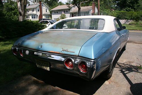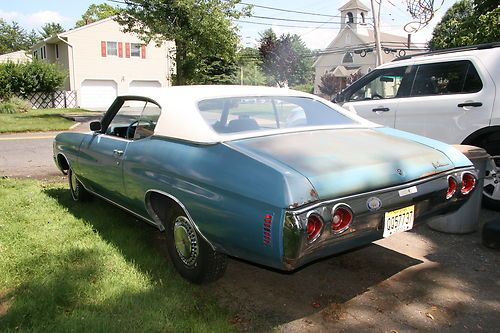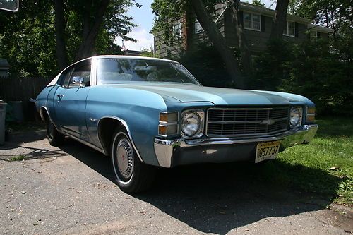 1971 Chevy Chevelle with 80040 original miles. Car is Ascot Blue with white vinyl top, 307 Engine which was recently renovated along with bench seat, and has powerglide transmission. Car is in great shape for year, excellent second car or everyday driver, very reliable. I am second owner of car and have original sticker, warranty plate and showroom catalog. Buyer must arrange for shipping. Certified Bank Check as payment please.