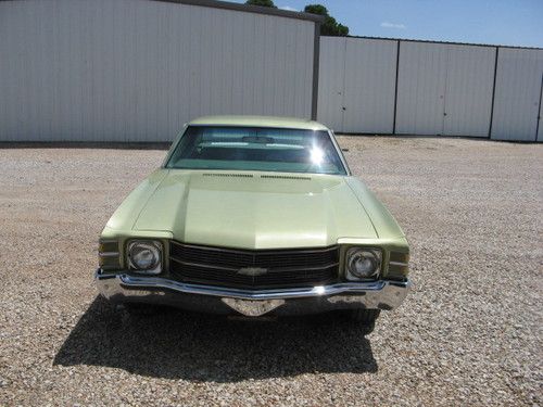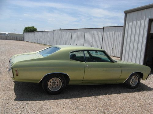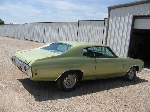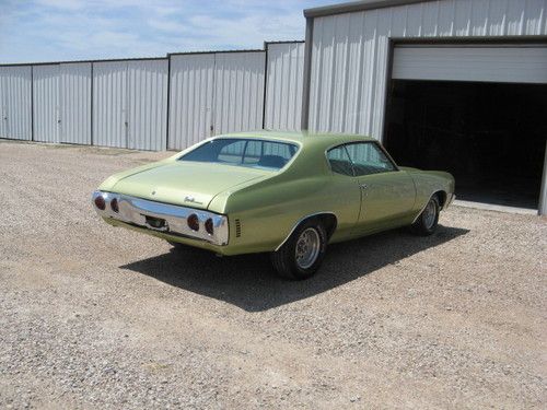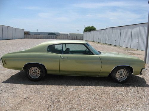 THIS IS A 2 OWNER MATCHING NUMBERS 1971 CHEVY MALIBU' SPORT COUPE' THE ORIGINAL 307 ENGINE WITH THE 350 TURBO TRANS' WERE REBUILT' FACTORY A/C' POWER STEERING' CHEVELLE' FRAME ON RESTO''THE INTERIOR HAS BEEN REDONE AS WELL' WE TOOK A RUST FREE AND LASER STRAIGHT BODY' BACK TO THE ORIGINAL COTTONWOOD GREEN' NEW CARPET, ALL DOOR AND WINDOW GASKETS' NEW WINDSHIELD,REAR WINDOW RESEALED, NEW TRIM PARTS,OVER MOST THE CAR' THE BFG'S LOOK NEW' THERE ARE OVER 5 YRS OLD'' SMALL DENT IN LEFT REAR BUMPER'''CAR IS SHOWING LITTLE OVER 5 K IN MILES'I DONT BELIEVE THAT'S CORRECT' VERY NICE DRIVER'TO SAY THE LEAST' NEEDS A FEW THINGS WHICH WILL BE ADDED THIS WEEK'THE DRIVERS DOOR MIRROW, AND THE A/C COMPRESSOR' TOOK 8 MONTHS TO DO THIS CHEVELLE RIGHT'HAVE PHOTOS' DON'T MISS OUT ON THIS RARE 1971 MATCHING NUMBERS SPOT COUPE CHEVELLE' OWN A PIECE OF HISTORY'' CHEVELLE IS FOR SALE LOCAL SO I RESERVE THE RIGHT TO END THE AUCTION EARLY' GOOD LUCK