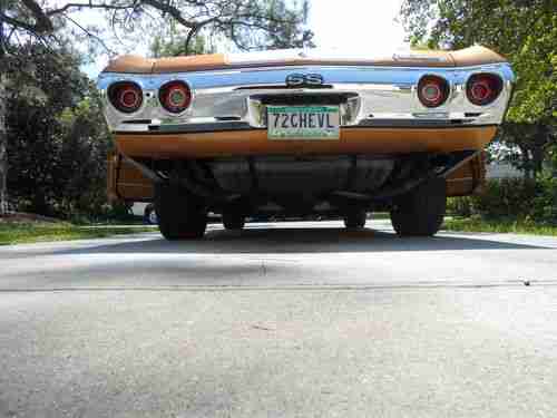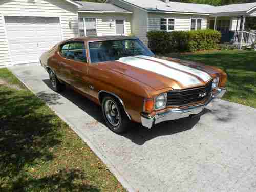 This car was sold to the original owner by Jordan Chevrolet in 1972, located, at that time, in Timmonsville, SC. The dealership is no longer in business. The original owner had bought the car while living in Darlington, SC. She passed away without heirs or a will and her entire estate went up for auction in February 2005. I went to the auction in hopes that this car would worthy of bidding on, and I was right. I bought the car at the auction as the highest bidder. I drove the car home without any problems. It showed 10K miles on the odometer, and I'm sure it had turned over one time. But, I bought the car because it was in fantastic condition, had no signs of rust or having ever been wrecked, and it was whole and all there. As soon as I got the car home, I began a 2 year restoration. Since I've owned it, I've driven it 30K miles. So, it currently shows 40K miles, which is more than likely 140K miles. I started a restoration on the car begining with the drive train and running gear. The engine was professionally rebuilt by one of the top engine building machine shops in South Carolina. The dished 8.5 compression pistons were replaced with forged flat top 9.5 pistons, the cylinders were cleaned up, and all new bearings were replaced on the bottom end. The heads were freshened up with all new stainless steel valves, new springs, and, I've installed a Competition 270 Magnum Camshaft. It idles with a nice lope and it is crisp and responsive without hesitation or stumbling. The TurboHydramatic Three speed was professionally rebuilt and a new torque converter was installed. The entire front and rear suspension was rebuilt. A new 2 1/4 inch aluminized true dual exhaust system was installed with factory style low restriction high flow mufflers and factory chrome tips. The car rides on 15X8 inch Corvette Rallys and P235/60R15 BF Goodrich Radial Tires. The engine breathes through a GM Performance Parts cast iron Z/28 high rise intake and a 1970 Corvette 350 C.I. 350 HP Quardajet 4 barrel carburetor. It has a Pertronix electronic ignition unit in the factory distributor and the engine puts out a true 300 horsepower at the flywheel. The interior was redone in factory style and the carpeting was replaced. The factory installed AM radio is still in the dash and still works. All front sheet metal was replaced including new inner and outer fenders, a new domed hood, and a new trunk lid was installed. Both front and rear bumpers are new and most trim and molding has been replaced. All that is left to be done to the car should I keep it is to replace the sweep dash with an SS style dash, install a new sound system, and repair the factory air conditioning system. It is a numbers matching car and was repainted the factory color - Mojave Gold. I am selling the car because I feel I have reached the point with the money invested that I will not be able to get it back should in spend any more, and would like to take on a new investment. It rides very nicely and has won numerous awards at car shows. It gets a lot of attention and has been a joy to own. It runs on pump gas and sound very powerful. I have a true $25,000 in the car with what I paid for it and will negotiate a price close to that amount. Contact me @ 706-231-6380 to arrange viewing and bidding on the car.