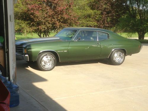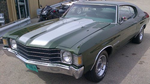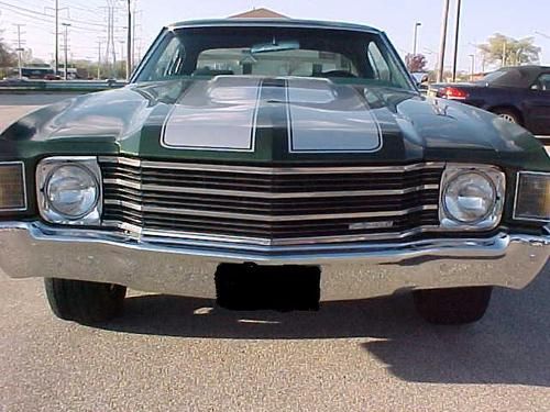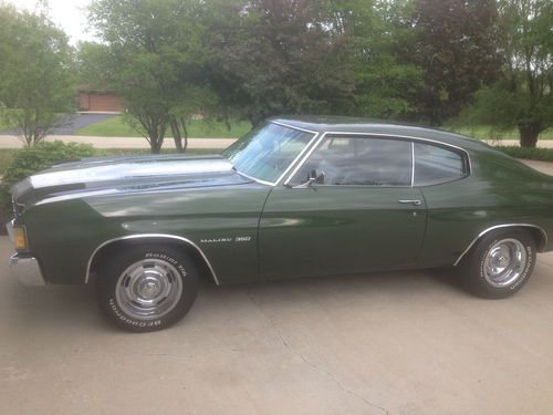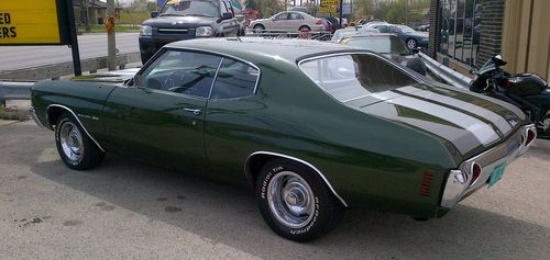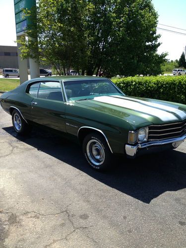 I am selling my dark green 1972 Chevelle Malibu 350 with 350 turbo transmission and dual exhaust (Sounds like a BIG BLOCK). Dark Green with Silver Rally Stripes buried under the clear coat. Paint on the car is fabulous. Interior is near mint. Seats, headliner, carpet, dashboard, door panels are all in grat shape. Factory Rally Wheels with RWL BF Goodrich Tires. Engine starts with a touch of the key. It is a head turner everywhere I go. This car is in great driving shape; get in and go anywhere. It will always be a classic, only increase in value over time, and will be a great investment. There is a lot of cut up junk out there so do yourself a favor if you want to buy a good, solid, honest car, come look at this one. I can send more PICS by request. Can help arrange for shipping.