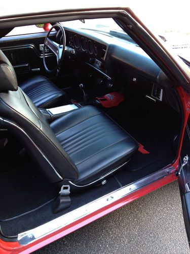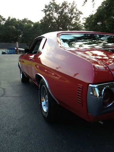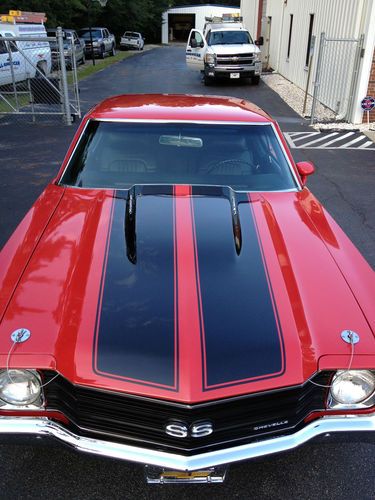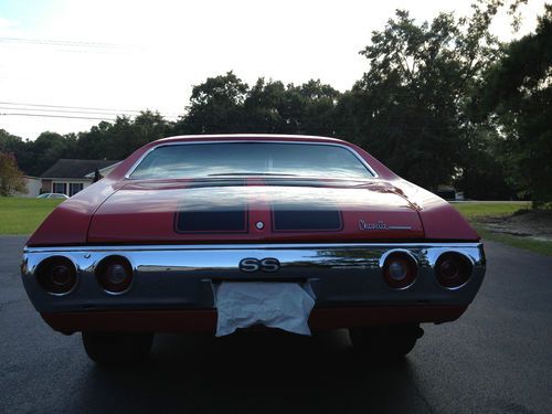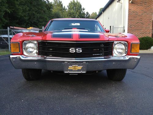 Up for auction is a 1972 Chevrolet Chevelle SS 454 Coupe. This car went through a full frame off restoration completed in 2006. Less than a 1000 miles have been put on car since restoration. Exterior of car is Chevy red with black racing stripes. All new chrome and trim throughout car inside and out. New tires and rally wheels. 15x10 on rear and 15x7 in front with BF Goodrich tires. Underneath the fully functional Cowl Induction hood is a new 454 BIG BLOCK motor with aluminum intake and Holley double pumper carb. Car is driven by a Tremec TK600 5 speed transmission with a Eaton posi traction unit with 3.42 gears. Also have going with car the original M22 4 speed transmission. Custom built Bassani Stainless Steel Exhaust system with a great sound. Under carriage and engine compartment are very clean. Car has total Hotchkis front and rear suspension. It rides like a new car only with alot more power. Interior is new with leather covered bucket seats in the front and bench in the rear. All new guages, wiring, and stereo with cd changer in the trunk. All the glass is new with all new window mechanisms. Has ice cold A/C for those hot summer days. There is just to much to list with all the new items, this is literally like a new car. The only flaw on the car is where putting hood back on car recently scratched the paint on the fender as shown in the pic below. Other than that car is in immaculate shape. Can get more pics if needed. Please serious bidders only and do not place a bid if you do not have the funds. If any questions you can call Steven@ (803)260-7580 GOOD LUCK