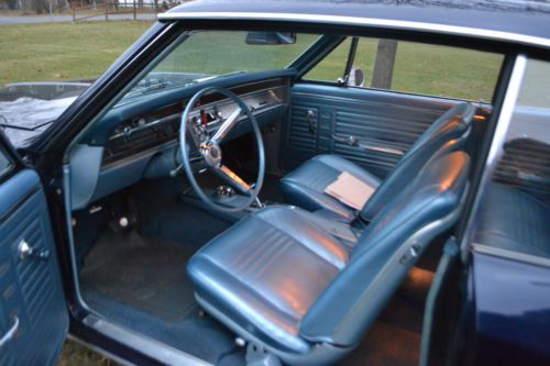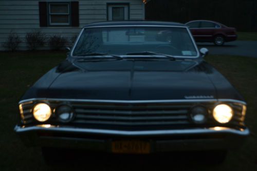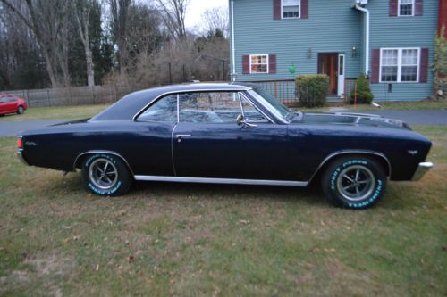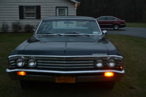 up for sale is a super nice 67 chevelle sports coupe with original dark blue paint with some checking from its age but no rust or rot.Car has all factory interior light blue bucket seat console on floor every thing works as it should even the clock in the tach.rebuilt original 327 motor with a powerglide transmission 10 bolt open rear.Car came with tinted windshield power rear antenea all chrome nice.car has new dual exhaust with original exhaust manifolds.front disc brakes no power steering but I have the power steering to put on with pump brackets and steering box.Car has 14" ss wheels with brand new tires new center caps and lugs.This car runs and drives great this is an uncut car .Motor has a holley 4 barrel carb with electric choke.LOOKING to sell OR POSSIBLE TRADE CHEVY ONLY.