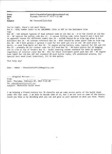 70 Ls6 W- Factory Build Sheet & Confirmation From Chevellestuff/ls6registry.com on 2040-cars