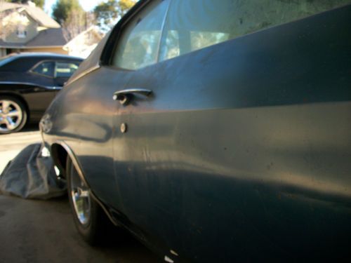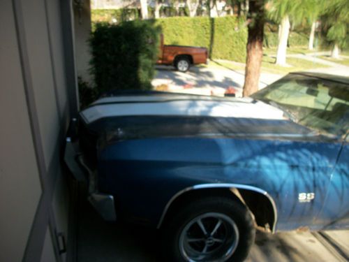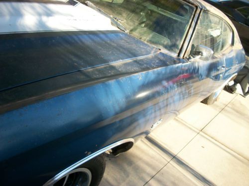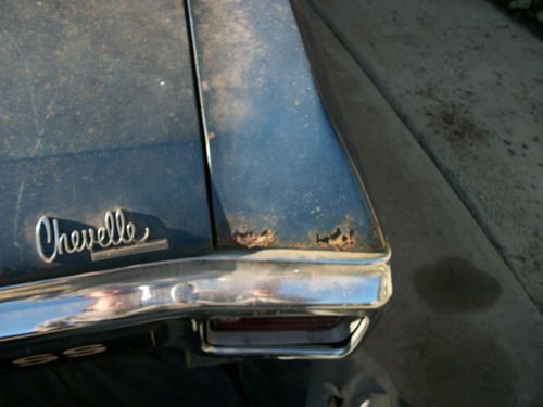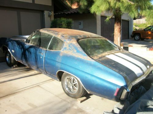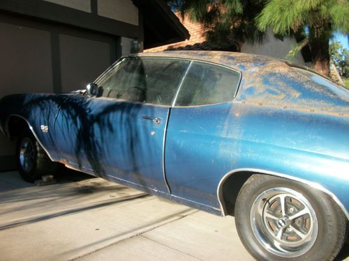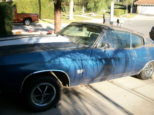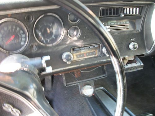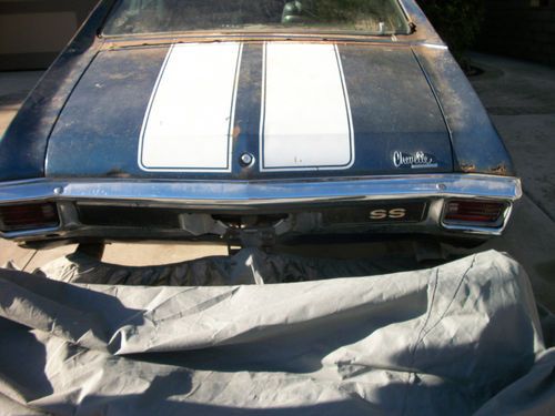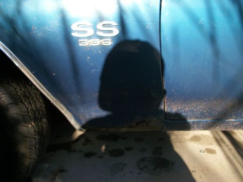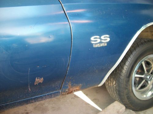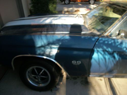 - The car is blue with white SS striping. Body is straight, all original equipment from the factory is still on the car. I have the motor and transmission out of the vehicle but are included with the vehicle which are the factory motor and trans. Engine needs to be rebuilt. The motor is at standard boar and the transmission is an automatic turbo 400. All numbers match the car. I have the original build sheet from the factory order. I have the protector plate made for the original owner. Car was last registered in 1987 in Oregon from the original owner. I have the title to this vehicle in hand. The interior is black and in pretty good shape. Front bucket seats. Center console with h-shifter (factory). SS guages, tilt steering, original equiped factory air-conditioning, power assisted brakes, fronts are discs, rears are drums. The original am/fm factory radio is still in it. Dash pad and headliner are good. Floor board, doors, door jams, and body, are pretty much rust free. Lower front fenders; small rust at bottom which are common. Little rust around lower rear window which is easily fixable. Quarter panels, trunk lid, hood, glass, grille, bumpers, lighting, wiring, wheels, tires, are all in good shape. I have some extra parts, some are new, some are used, I purchased for the restoration of this Chevelle. They are also included. If you are looking for an original SS Chevelle to restore and own or resale LOOK No Further!!