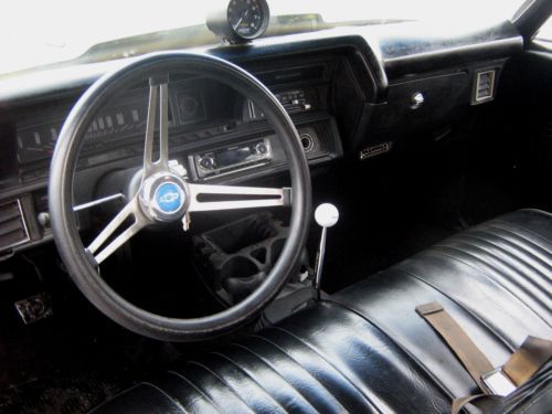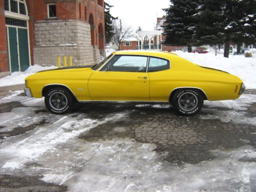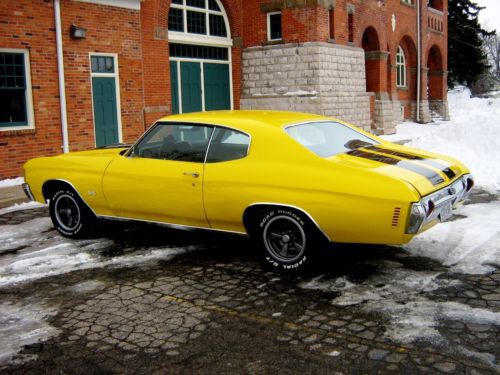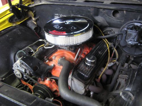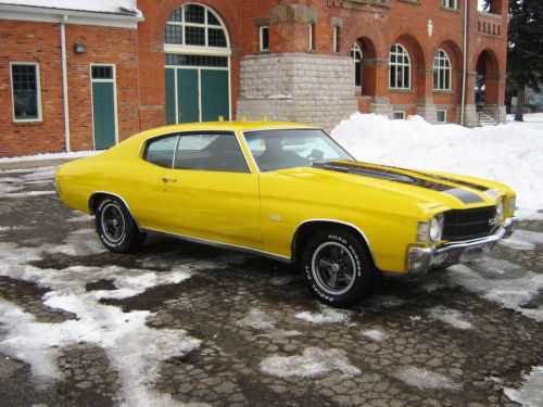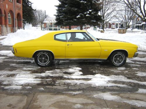 HELLO.. UP FOR BID IS MY CLEAN 1971 CHEVELLE TWO DOOR HARDTOP WITH THE 350 V8 / 4 SPEED. THE CAR LOOKS BEAUTIFUL AND IS PAINTED THE BEAUTIFUL COLOR COMBINATION OF CHEVROLET BRIGHT YELLOW WITH BLACK SS STRIPING. THE CAR WAS PAINTED APPROXIMATELY 2 YEARS AGO AND THE PAINT IS STRAIGHT AND SHOWS VERY NICELY. I JUST PULLED OUT OF STORAGE TO TAKE THE PICTURES SINCE IT WAS A VERY WARM 36 DEGREES OUTSIDE TODAY. THE PICTURES WERE TAKEN IN FRONT OF A BEAUTIFUL LOOKING CHURCH BUILT IN 1873 EARLY TODAY {PLEASE SEE ALL PICTURES}, WOW DOES THE CHEVELLE LOOK SO SPECIAL IN FRONT OF THAT STUNNING LOOKING CHURCH. ALL THE GLASS IS VERY NICE, DOORS SHUT EXCELLENT AND HAS STOCK CHROME TRIM. THE CHROME BUMPERS LOOK NICE AND ORIGINAL. IN FACT, THE FRONT CHROME BUMPER STILL LOOK NEW. THIS CAR JUST GLOWS. THE UNDERNEATH IS VERY CLEAN AND SHARP WITH NO HOLES AT ALL. THE TRUNK IS EXCELLENT AND CLEAN {SEE PICS PLEASE}. THE 350 V8 ENGINE RUNS GOOD WITH THE 4 SPEED TRANSMISSION. HAS THE 10 BOLT STOCK REAR END, THE CAR STARTED RIGHT UP AND AFTER WARMING UP A BIT AND SHE DRIVES OUT EXCELLENT. CAR IS HEATER DELETE AND HAS BEAUTIFUL LOOKING RALLY RIMS WITH EXCELLENT WHITE LETTER TIRES. THE INTERIOR IS NICE WITH FULL BENCH SEATING. CAR IS ALSO EQUIPPED WITH A MIDDLE HURST 4 SPEED SHIFTER. THE BACK SEAT IS IN SUPER CONDITION. THE CARPET LOOKS ORIGINAL AND IS OLDER. THE DASH LOOKS NICE STILL. HAS AFTERMARKET TACHOMETOR {SEE INTERIOR PICS PLEASE}, THE BRAKES ARE REAL NICE AND HAS HEADERS WITH PERFORMANCE MUFFLERS AND TIPS ENDING UNDERNEATH. THIS CAR SOUNDS MEAN AND AWESOME. SOMEONE IS GOING TO GET ONE SHARP LOOKING CAR. I GET STOPPED BY EVERYONE WANTING TO TAKE PICS OF CAR. AS YOU KNOW IT IS BECOMING INCREASINGLY DIFFICULT TO FIND A CLASSIC CHEVELLE THIS NICE. IF YOU ARE IN THE AREA AND A SERIOUS BUYER, PLEASE STOP BY AND INSPECT THE CAR BEFORE BIDDING IF YOU WANT. IF YOU ARE CONSIDERING SHIPPING, I USE A REASONABLEY PRICED INSURED TRANSPORTATION COMPANY. I CAN GET YOU A GREAT PRICE SHIPPING QUOTE IF YOU PROVIDE ME WITH YOUR LOCATION OR ZIP CODE. THE TITLE IS FREE AND CLEAR WITH NO LEINS AT ALL. I KNOW I HAVE A VERY LOW BUY IT NOW PRICE FOR THIS CLASSIC. THE CAR IS NOT A PERFECT SHOW CAR HOWEVER IT IS VERY NICE AND A DRIVER QUALITY CHEVELLE TO BE PROUD OF AND ENJOYED. I TOOK TONS OF PICTURES TODAY TO SHOW HOW CLEAN THE CAR IS. IF YOU’D LIKE TO MAKE A FAIR OFFER ON THE CHEVELLE PLEASE DONT HESITATE AS I WILL CONSIDER ANY FAIR OFFER. I’M SAYING THIS BECAUSE MOST OF MY CLASSICS SELL BEFORE THE AUCTION ENDS. FOR THAT REASON, I RESERVE THE RIGHT TO END THE AUCTION EARLY. THANKS FOR TAKING THE TIME TO VIEW MY AUCTION AND MAY GOD BLESS YOU AND YOUR FAMILY.