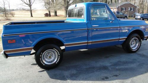 up for sale is a beautiful 1971 Chevrolet super Cheyenne. This is a north Carolina truck has been here its whole life a rust free truck that has only had one repaint. back in 1983.This truck has been garage kept ever since and is mostly all original except the steering wheel ,new seat cover, heater controls,and a few items under the hood such as plug wires water pump etc etc!! The truck has all original sheet metal, grill, lights, factory floor mat. This truck has a super clean undercarriage as well the only few flaws and things I would fix is the bottom of the doors as pictured on both sides needs fixed as I have pictured as age has went on the bottom of the doors has a couple rust bubbles coming out wouldn't take nothing to fix it as well as the drivers door has a circle place in the paint also. The cab bushings could use replacing as it wouldn't take much to do what little stuff it needs for a 1971 truck. It is in superb shape that has not ever been restored just repainted this is a super nice truck shows well. also has factory moldings that came on it all the way around don't miss this chance on this truck as I go to all barrett Jackson auctions and sell cars this truck will be started on in the next couple weeks doing what minor things need done to it and took to the palm beach auction if not sold here these trucks bring in the 30-60k dollar range this truck is a no brainer at the BUY IT NOW price of 14,500.00 they are very hard to get this original and for only this little of money for a truck of this caliber. it would make a great addition to add to anyones car collection or for someone wanting a nice ole collectible truck these trucks just keep getting harder to find this original and keep going up in value call chris with questions or to buy it now at 336-416-5631 thanks don't miss this it is a great buy for somebody looking for one