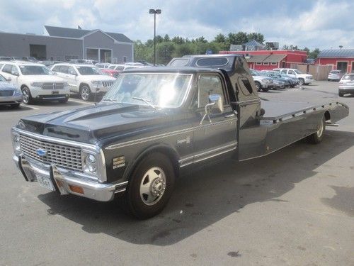 Up for bids is a CLEAN GM Factory 1972 Chevrolet Cheyenne Car Hauler/Ramp Truck. This truck is all original. Engine is a stock 454ci Chevy big block V8 w/ 58,524miles. Truck is a dually rear end with RWD. Exterior is very clean with minor surface scratches and blemishes, practically rust free. The cab corners are very clean. Only the passenger door has a rust bubble the size of a dime on the bottom. Underneath nothing major but just typical surface rust, same with under the hood. On the ramp passenger side a crease and surface scratches in front of the wheel. Stainless dual exhaust. Aftermarket 2inch Cowl Induction Hood. Ramp part of the truck has extra storage behind the cab and a winch. The ramps pull out with ease. Interior is all original with original dash, seats, and interior door panels. Vinyl headliner. Factory gauge cluster with a RARE factory Tachometer. Aftermarket radio and aftermarket tow brake installed (previous owner). Passenger door does not open (needs to be pulled apart, latch mechanism). This truck was a Tennessee truck. Truck starts right up and drives nicely. When purchased truck was driven from TN to MA. This truck would fit in any car collection or to be used as a rare hauler for your classic show car. Please feel free to contact me on Ebay with any questions or request for more pictures. I have extra close-up pictures of the exterior imperfections contact me for them. My name is Craig. Thank You and Good Luck Bidding.