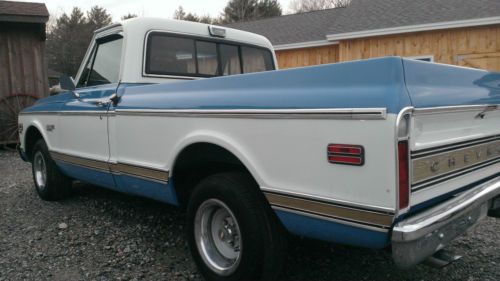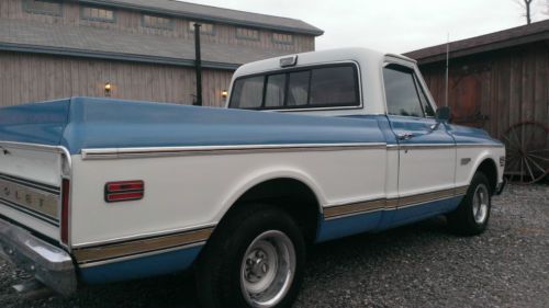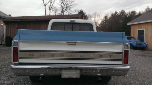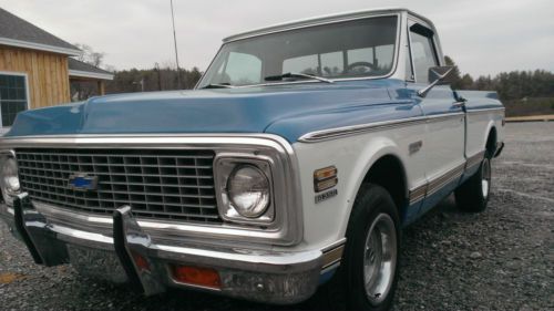 This is your Chance to own a real 1972 Chevy Super Cheyenne Half Ton Short Box Fleetside 2WD.. This Truck Is Loaded With an infamous rebuilt 350 V-8 4bbl (with slight cam).possi, and working A/C From Headers to Tailpipes she’s' Dual Exhaust... 12 Bolt rear, Factory Rally Rims, Tinted Glass, Dual Outside mirrors, rear Cargo light with sliding rear window. To Top It Off This Two Tone Cheyenne with Custom Interior a headliner wooden bed and factory gauge tack. Has Chrome bumpers and The Front has A Bumper Guard Also. Wow!! What A truck, Perfect for Anyone Wanting a Respectable Great Handling/ Driving Truck...