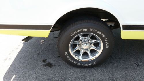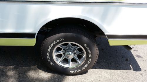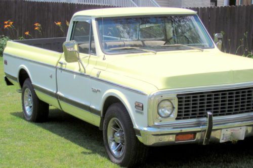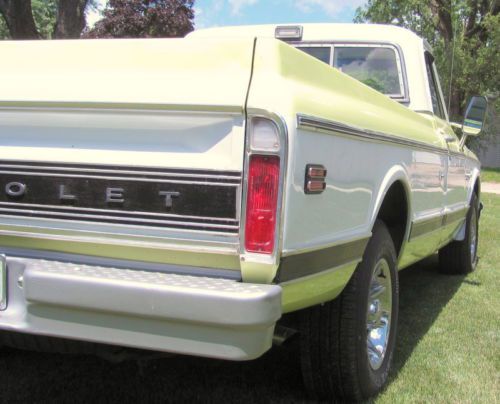 I am selling this for a friend. His name is Wayne, and his number is (708) 557-2300. Please do not email me with any questions. Give Wayne a call. This 1972 Chevrolet Cheyenne Super Custom Camper Special is a true survivor, oiriginally from Idaho. It is truly a top-quality, highly original driver that has been very well taken care of, and is up to any task. The certified actual mileage is just 87,800. Vehicle is driven during the week, so a few mils will be added. Certification of mileage will be provided upon sale. Look at the list of items this truck came with from the factory: *402 Big Block, Original motor, all original specs. *Power Disc Brakes, rotors and pads show very little wear *Power Steering *Factory Air Conditioning, recently serviced, very cold *Automatic Trans. Turbo 400 *Factory Dual Exhaust *Chrome and Stainless Trim options *Factory tilt steering wheel, a very rare option In addition, the following has recently been completed: *New Tires, Hoses, Belts, etc *Beautiful, aftermarket 16" wheels. Tailpipes replaced with original equipment equivalent. Complete tune-up, plus new filters. You do not need to do anything to this truck but drive it, and keep it clean. This is a Fantastic Cruze 'N Use Classic. You can show it very well in local shows, and be very proud as the owner. This truck was re-painted at some point in the original factory color scheme, Lemon-Lime with white. It was a high-quality paint job, and the color really pops, much better than the pics show. It is showing just a few very small spots of buff-through on a couple of the sharp edges. The pictures taken could not make it show up, but if you are very close to the truck, and looking for it, you can see it. This is not something anyone would see unless they are really examining the paint. With the exception of the seats, the interior is in fully original condition. Door panels, headliner, dash, steering wheel are all original. The seats have been recovered in a top-quality material similar, though not identical, to the original factory seats. Cushions/bolsters were replaced at that time, so the seats have provide a lot of support, very comfortable. There is no rust perforation anywhere on this vehicle. All lights and gauges function as they should. THIS TRUCK DRIVES LIKE A DREAM! Straight down the road with no shimmy or wandering, no vibration anywhere, at any speed. Stops quickly in a straight line, thanks to the rare Factory Power Disc Brakes. It handles very well, corners like a modern truck. With the factory 402 big block, you have plenty of torque to get you moving quickly. The engine does not overheat, or burn oil. The transmission shifts smoothly, with no unusual noises. The bed has no dents, and is covered in a nice Silver-Gray spray-on liner that is a couple years old, and in good shape. Look closely at the pics to see the perfect sheet metal throughout the body of this truck. The truck, and it's owner, Wayne, reside in Illinois. He has owned it over a year, and, and has driven it regularly during that time. He is a knowledgeable and detail-oriented auto enthusiast. He put much more time and money into it than he will ever get out. He is only selling it because his plans have changed, and he needs the money to complete other restorations. This truck was not bought with the idea of being a "flip". It was bought to fix up as a fine classic vehicle, which it now is. Wayne can be reached at (708) 557-2300. Be sure to have a list of questions ready, as he will answer anything you ask about the truck. Please do not call after 9:00 p.m., Central Time. The winning bidder is required to pay $500, via paypal, or overnight certified funds, within 72 hours of close of auction. The balance must be paid within 7 days, via Certified funds, which are subject to "hold" until fully cleared, or via wire transfer. No other forms of payment are acceptable, and no trades are acceptable. Buyer is fully responsible for transportation of vehicle. Seller will work closely with buyer to meet reasonable needs of transport company. The seller provides no warranty of any kind, expressed or implied, on this vehicle. Bidders are urged to call for more information, and to personally inspect the vehicle, or have a personal contact in the area inspect the vehicle.