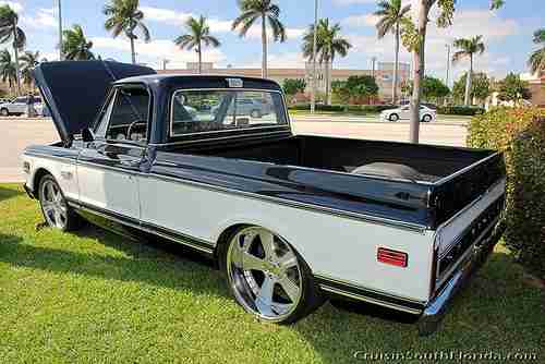 Thanks for looking at this Amazing 1972 C-10 Restomod built by Miranda Built in Florida.This C-10 is as nice as they come this was a complete nut and bolt restoration with every piece either refinished or replaced.The truck is powered by a 572 ci big block chevy with a Fast fuel injection system putting out over 800hp.For the low gear cruising and high gear highway flying a built GM4180-E transmission was installed with a 10-inch Yank racing convertor and a 3000 rpm stall convertor.The rear end is a Strange Engineering Fab 9 rear end with a 3:70:1 gears and 35 spline axles all based around CPP tubular rear suspension system.A set of QA1 shocks dampens the rear suspension,and CPP 11-inch drilled and slotted rotors provide the clamping force out back.The truck has Classic Performance Products 2-inch dropped spindles and coils to get the nose to business level,while CPP four piston brakes with 12.5-inch rotors keep speed passes in check.All the brake lines are custom bent and run perfectly along the powder coated frame.The rims are 20x8.5-inch front and 22x12-inch rear DONZ three-piece powder-coated wrapped in P245/30ZR20 front and 315/25ZR22 rear Pirelli P-Zero rubber.For the body the factory lines and paint scheme stayed true to its original glory but with the stake pockets filled and the inner fender wells and firewall all smoothed out by Miranda Built and then a perfectly laid out Black and White paint job with PPG materials was applied.The interior is equally as impressive with all custom stitched black and suede leather over memory foam for optimum comfort.There are way to many extras to list and please email me if you need more pictures i can email you link of the entire build.This C-10 runs,drives and stops amazing and has a custom a/c system installed to boot.The truck cost well over 85k to build and took nearly a year the lucky new owner will be the envy of all who see this truck.The truck was featured in Street Trucks Magazine in May 2011 and since then always garaged and barely driven just to local shows and this past years Daytona Turkey Rod Run.Please feel free to email me with any questions or offers,Florida residents must pay 6% sales tax and tag or transfer.Transportation is the responsibility of the lucky new owner we will assist any way we can with storing and loading.The C-10 is sold as is but Please feel free to read our feedback and bid with confidence,thanks for looking and good luck!!!