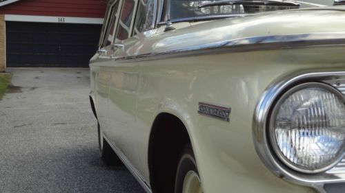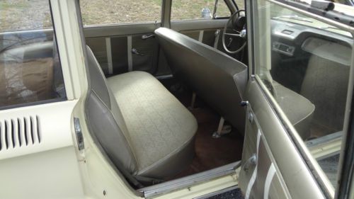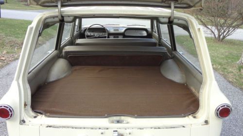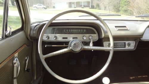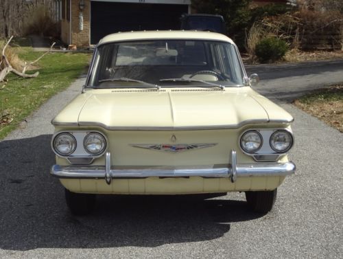 This auction is for my 1962 700 Series Corvair Station Wagon. I bought this wagon in 2009 from an elderly man in San Antonio, Texas with hopes of working on it and driving it often, but life and other projects have been in the way and I now need to free more space in the garage. For the last four years the car has been sitting in a climate controlled garage and has only been driven around the block from time to time. This is a very solid, straight, presentable wagon that can be enjoyed as is or it would make a great foundation for a restoration. The body of this wagon is very solid and rust-free. There is no rust evident in the common trouble spots such as the floors, rockers, door bottoms, wheel wells, trunk area, etc. I see no evidence of any prior rust repair whatsoever. The car is also very straight and the body panels all line up very well. At some point in the car's history, the front end from a 1960 Corvair was grafted to the '62 wagon, but the job was done very well and it looks factory in appearance. This modification might upset the purist, but I think it looks great. If you look very closely, you can see a minor wrinkle in the lower left rear valance panel (under the rear bumper), but it is the only spot on the car that isn't 100% straight. At some point before I got the wagon, it was re-sprayed in the original Coronna Cream color, but it was a very low budget paint job. No body work was done and very little prep work was completed prior to paint. I see no evidence of any bondo or rust repair, but there are places that should have been prepared better such as the front lower valance panel which was re-sprayed over some peeling original paint. Also, you will notice there are some blisters of rust showing from under the molding on the left front fender. There are no holes rusted through, but I would recommend taking the molding off and sanding and painting the area as it should have been in the first place. Overall the paint shines and the car looks very presentable, but it certainly is not show quality. The interior of the wagon is original and overall in good condition. The dash is very nice as is the stock steering wheel and column. The stock 3-speed floor shifter works well and even has the original shifter boot present. The original seat upholstery is hidden under custom made covers in the factory fawn color. The covers are in good condition and have no tears, but I'm uncertain of the condition of the factory upholstery underneath. The factory door panels are all intact, but they have some water damage. All the doors latch properly and the windows roll up and down well. All the glass is good. The horn blows, dome light lights when the doors open, headlights work, turn signals work, brake lights work; however some of the running lights aren't lit. Probably would work with new bulbs, but I haven't tried. All the weather stripping is original and is pretty well baked. Replacement weather strips are available and would be recommended for the doors, trunk and rear hatch. Mechanically the wagon seems to be in good condition. The engine starts easily, idles smoothly and doesn't smoke. The clutch works well and the transmission is quiet and shifts properly. I rebuilt the carburetors because the accelerator pumps weren't working when I got the wagon, but now they run properly. The battery is good and the charging system works as it should. The brakes work well and the car stops nice and straight. The steering and suspension seem to be good - nothing wrong that I know about. The tires are old bias-plys that have very good tread. They look to have very few miles, but they are old and I would consider replacing them before putting the car into regular use. I'm selling this wagon with a very modest reserve that I'm sure will be met before the end of the auction. Good luck bidding!