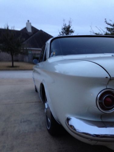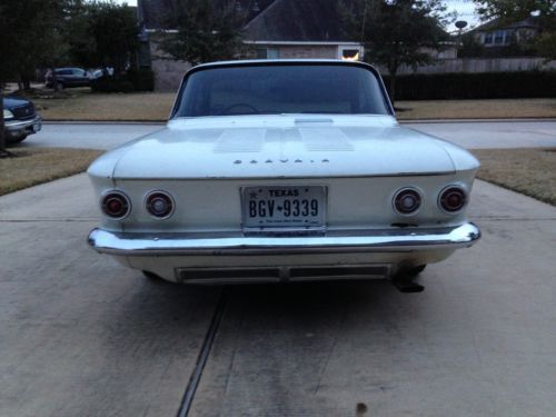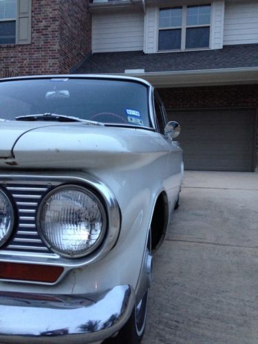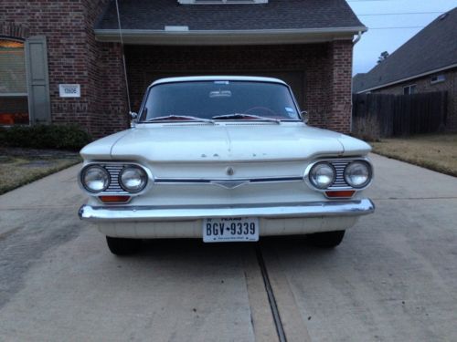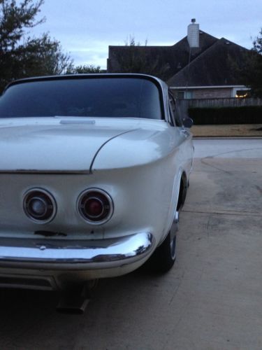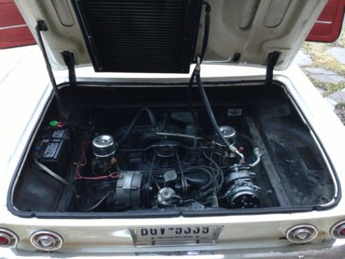 Exterior: This where she will need attention. The paint is in poor shape. It is the correct shade of Ermine White. The vehicle has had a repaint the prep work is poor as there is overspray in areas that could have been properly masked. There is overspray on some rubber seals in the doors. The paint is cracking in many areas. There are some dings here and there and paint has chipped on the door edges. There are some scratches present. If you are looking for a good driver and willing to paint the car you will be very pleased. If you want some detail pics of these areas just ask and I can forward additional pics. Overall it is a 15 footer. If you want show paint sorry you’ll have to strip her down and start all over as the car was painted over the original paint at one time. A good paint job by a competent shop will actually be more than the reserve on the car. However, a decent driver grade re-spray will set you back maybe a G or so. The Bright work is in good shape, although not perfect. A buffing wheel with rouge on the stainless would bring it back to life. The bumpers have their share of parking lot spats but are presentable. There are a couple of small dings present The bright trim around the lights is presentable but will need attention if you are looking for perfection. Like I said it is a 10-15 footer. The door and window felts are also worn and deteriorated and should be replaced. The original GM glass is in good shape. The windshield is peppered from 50 years of road use. It could use a polish, but not really necessary unless you desire crystal clear glass. The front hood Corvair script is loose but spares are included. the drivers side rear faux vent is missing but a replacement is being located.