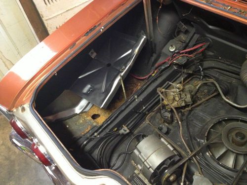 Exterior/Interior - The car had been sitting outside from 2000-2010 until I had room in my garage to store it, so it has been in dry storage for the past 3 years. As you can see from the pictures, everything is solid and complete except for the typical Corvair rust around the windows and the bottom of the doors/wheel wells. The battery box is rusted pretty bad, but I have the replacement Clark's panel for it. The front floor boards also have some rust holes as well. The trunk also has a few holes as well, and would need to be replaced. All of this is typical Corvair rust that happens when they sit. BUT, the trunk/deck lid, doors, fenders, etc. are all solid with no major rust. Both doors shut good and have a solid sound to them.
