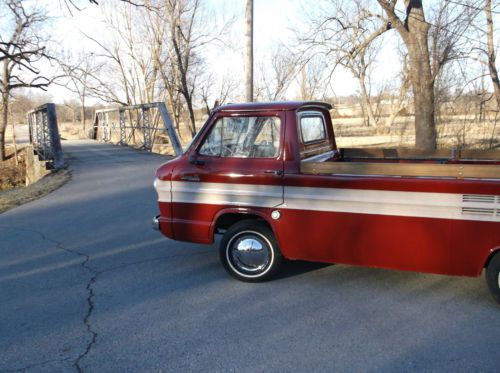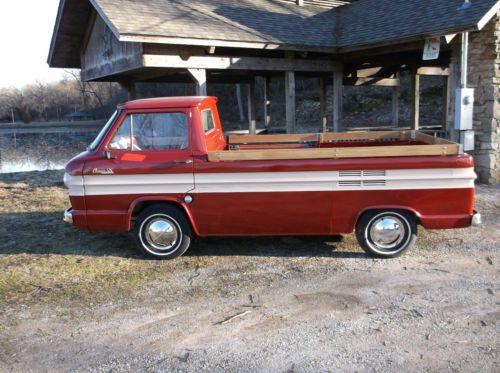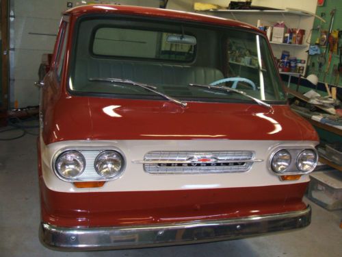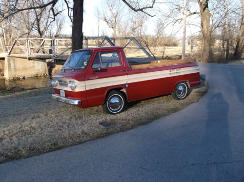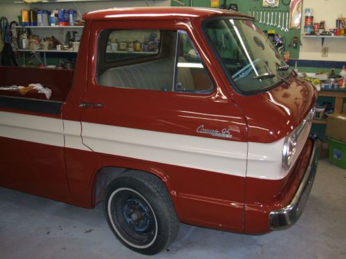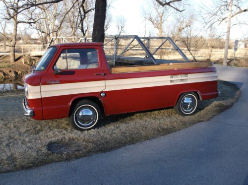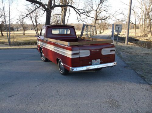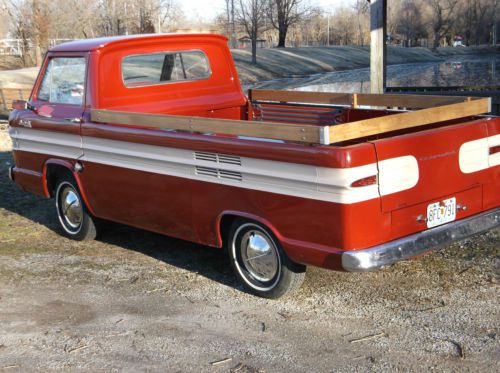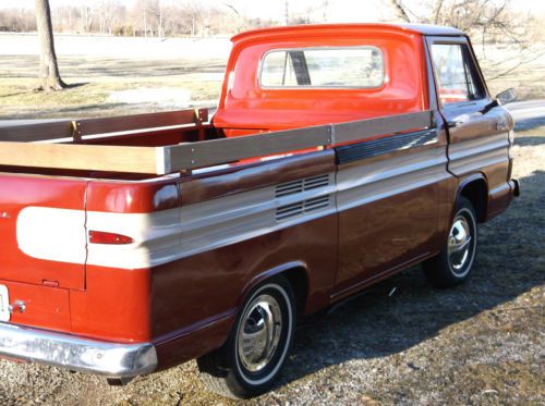 This truck was purchased from a local resident and had sat exposed in a field for several years. I am a Corvair enthusiast and have enjoyed putting them back on the road. (My first was a 65 convertible in 1970.) This truck required several major items. The most serious was the clutch/fly wheel/differential. All three items were replaced and/or overhauled. Note: The old Corvair used a three part, riveted flywheel which eventually causes failure of the clutch release bearing "bull nose" which results in a big mess. The differential was rebuilt due primarily because the "bull nose" replacement requires it. The new unit has the dual oil seal for the drive shaft of the transmission. Over the five years of my ownership I have accumulated possibly 2K miles. During that time the truck has had the following service items either replaced or overhauled. Tires,brake system ( wheel cylinders and linings) NO master cylinder work. Upper and lower ball joints replaced. New steering drag link. Rebuilt carburetors (each need the plastic pull off). New fuel pump. Added electric boost pump. Rebuilt starter. New oversize battery. Replaced/rebuilt heads. Rebuilt/re-upholstered seat. New ignition parts (plugs/points wires). Gas tank removed and cleaned and a new level sender installed. The interior cab has no modifications and is in very good condition.The body was examined closely and any obvious bondo removed and metal welded back. The use of non skid paint "grey" within the bed and ramp was to provide a good surface to stand on and also it camouflages the dings and dents. The truck starts and runs fine and is driven occasionally. The differential gearing was changed to a higher ratio for better economy. No attempt here or ever has been attempted to make this truck appear as anything but a unique WORKING truck. Those seeking a show vehicle should pursue other vehicles. BTW: The mileage shown is what is displayed on the truck. Actual mileage is unknown.