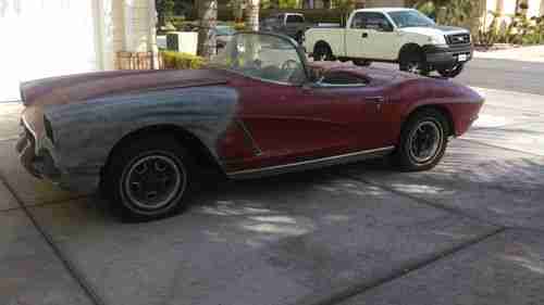 you are bidding on a 1962 corvette original black plate car 1 owner since new original title engine was rebuilt few years ago was starting to restore just don't have the drive to finish any more needs tlc have all the original parts car runs and drives no major body damage however as you can see needs some body and paint and interior work all glass great shape have all the chrome and dash parts for the car along with the bumpers original engine never been replaced and trans no major body cracks don't have the wheels where miss placed in storage car is being sold as is no warranty for more info call 951 536-9307 we reserve the right to end auction early
