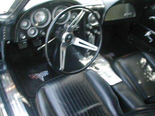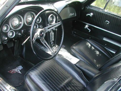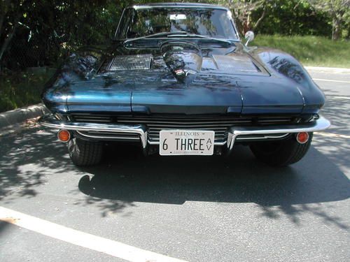 Daytona blue on black vinyl interior. 327/300 HP 4spd manual. Rare 63 Split Window Stingray Coupe. Early production car with storage wells under seats. Date code correct engine, see below. Data plate info--style 63837 trim--std body--1662 paint--916A